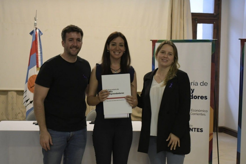 NOTA VIDEO Juan Estaban Maldonado Yonna, secretario de Desarrollo Económico; Thea Beláustegui, subsecretaria de Pymes y Emprendedores; Eduardo Acosta, emprendimiento Don Adriano escabeches; Juan Tarragó, El Litoral fábrica de velas.