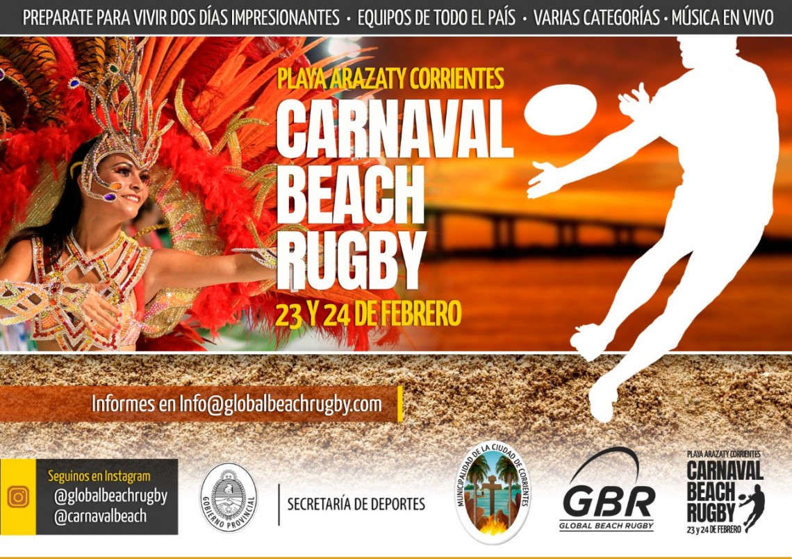 Este fin de semana la playa Arazaty será escenario nuevamente de dos eventos deportivos de primer nivel con la presencia de equipos de todo el país. Se trata de Carnaval Beach Rugby y Carnaval Beach Vóley, que además brindará espectáculos musicales gratuitos para vivir a pleno esta época carnestolenda que caracteriza a la Ciudad. “Esta propuesta como tantas otras que brinda la Municipalidad buscan posicionar a Corrientes como una ciudad de eventos”, destacó el secretario de Turismo, Cultura y Deportes, Gustavo Lorenzo Brisco.