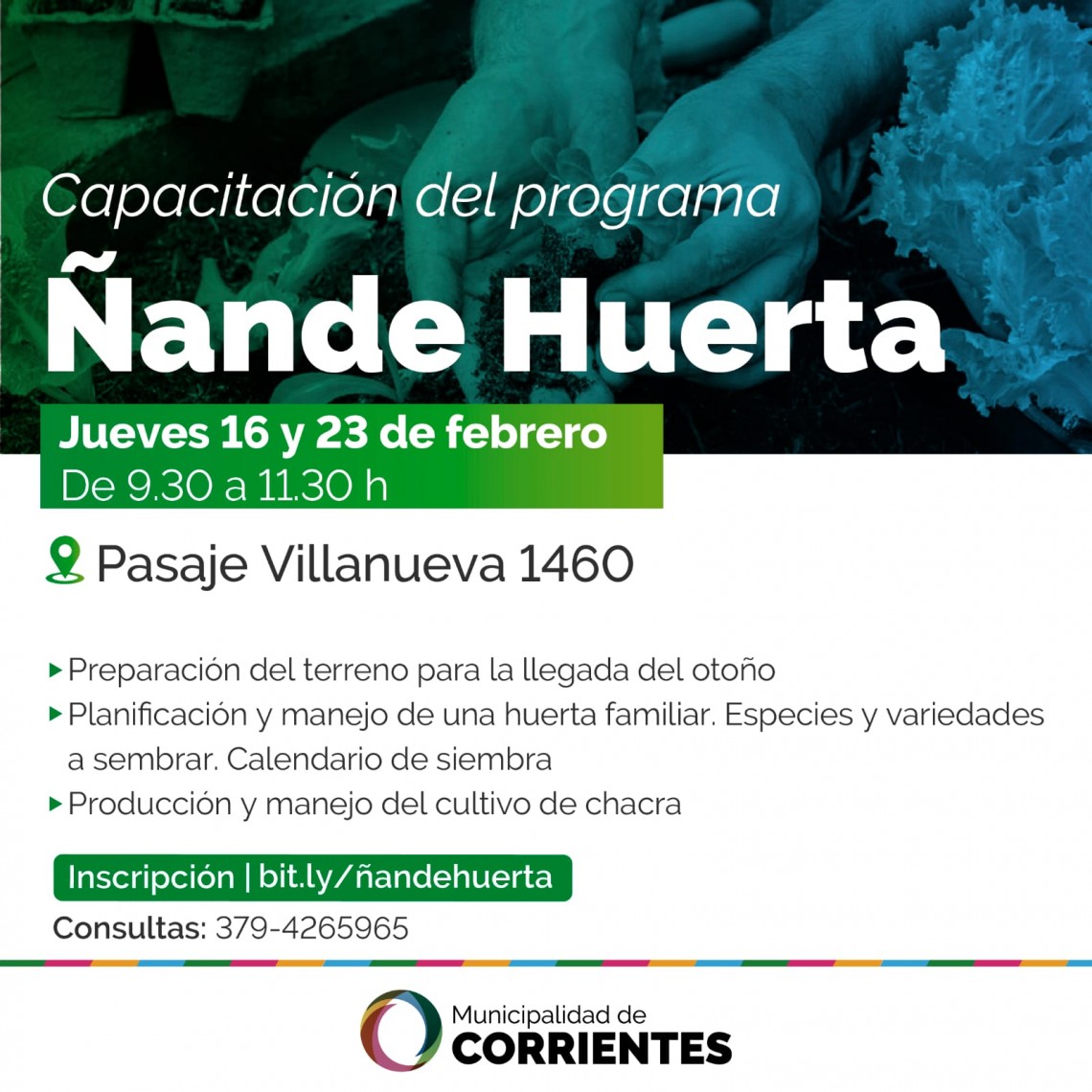 Organizados por la Municipalidad de Corrientes, darán inicio los talleres de la edición 2023 del programa Ñande Huerta. Estas capacitaciones sobre el desarrollo de huertas orgánicas se realizarán el 16 y 23 de febrero, de 9.30 a 11.30, en Pasaje Villanueva 1460. Los interesados pueden inscribirse completando un formulario: bit.ly/ñandehuerta o llamando al 3794265965.