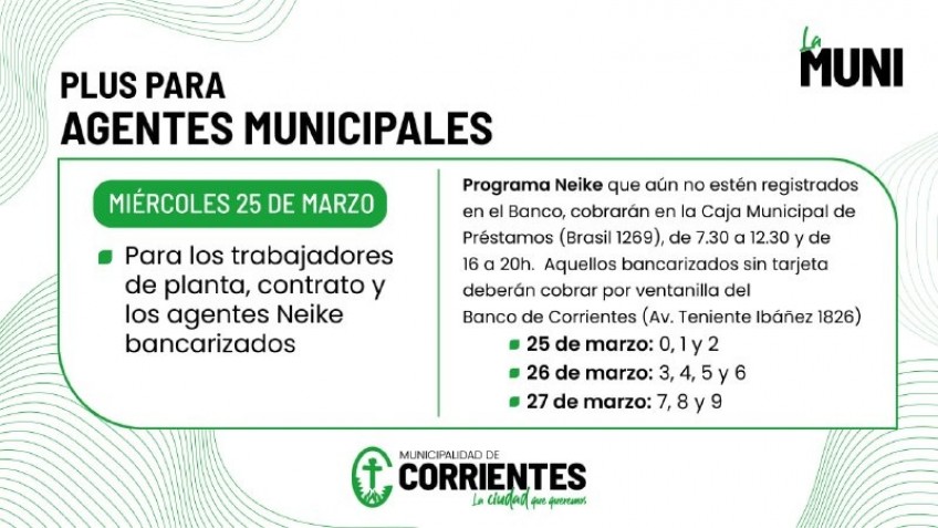 En tanto, los Neike bancarizados pero que aún no posean tarjeta de débito, deberán cobrar por ventanilla del Banco de Corrientes (sucursal av. Teniente Ibáñez 1826) de acuerdo al cronograma detallado anteriormente.