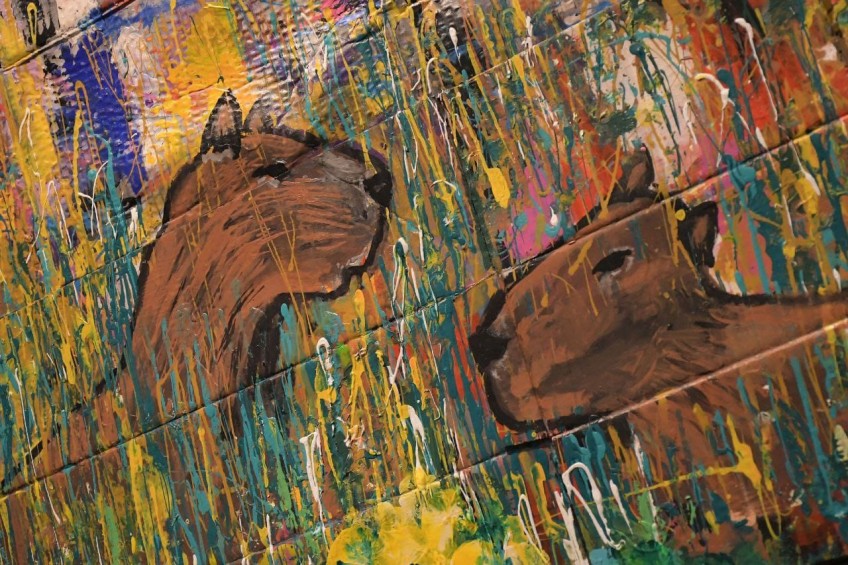 Gómez contó que para poder realizar esta muestra trabajó con materiales reciclados, como cartones y soportes rígidos, bajo técnica mixta. “Hay mucho acrílico, mucha pintura para exteriores que conviven y que hacen una amalgama en la mixtura del trabajo”.
