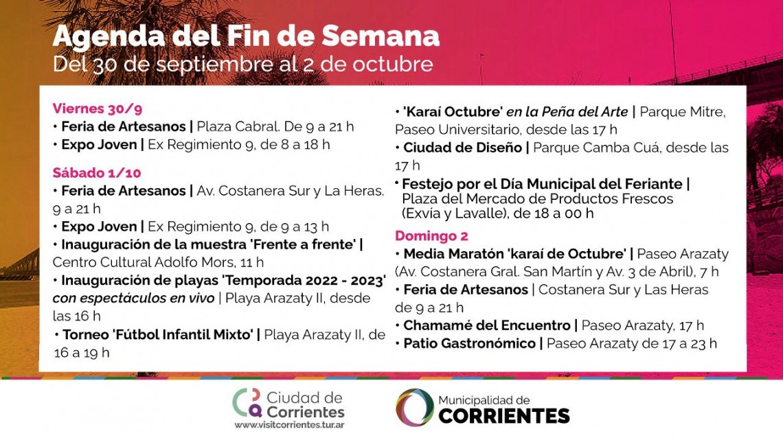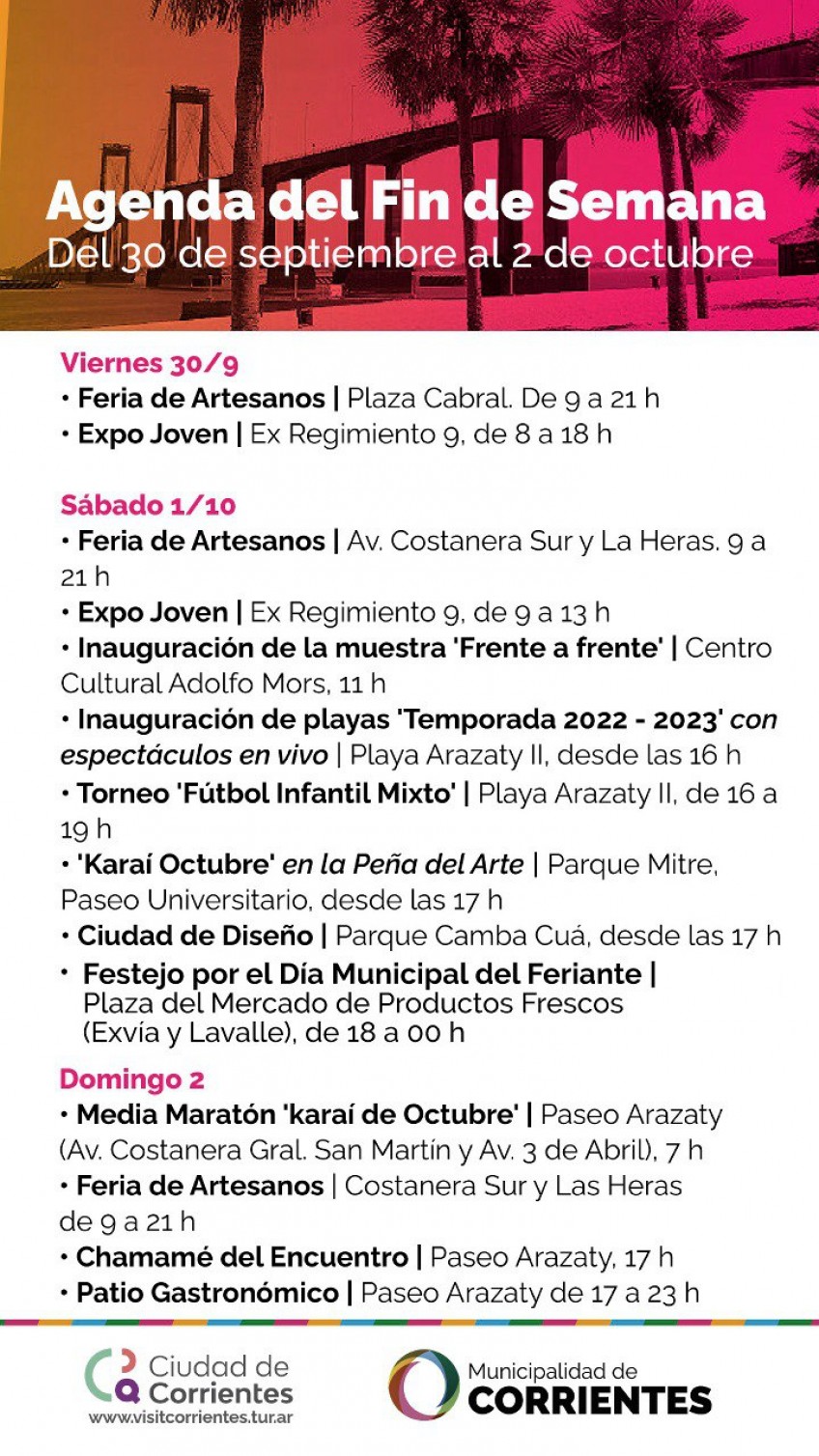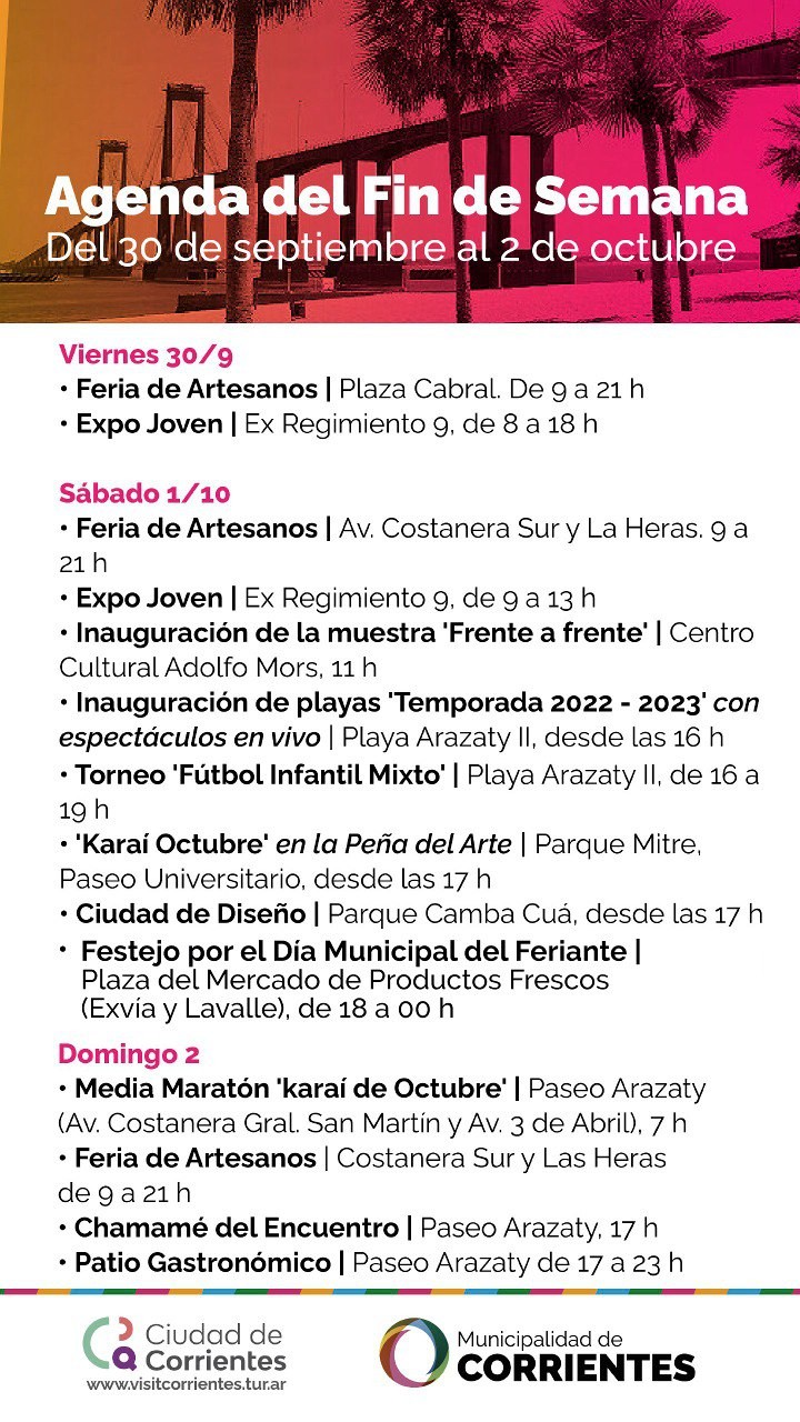 Cabe recordar que, en el marco del cierre por el Mes de la Juventud, la Municipalidad de Corrientes y el Gobierno Provincial está realizando –hasta el 1 de octubre- la Expo Joven "Elijo Corrientes" en el Ex Regimiento N° 9 (avenida 3 de Abril al 200), con la presencia de instituciones educativas, emprendedores y empresas. El jueves 29 y viernes 30 el evento será de 9 a 18, mientras que el sábado 1 de octubre será de 9 a 13.