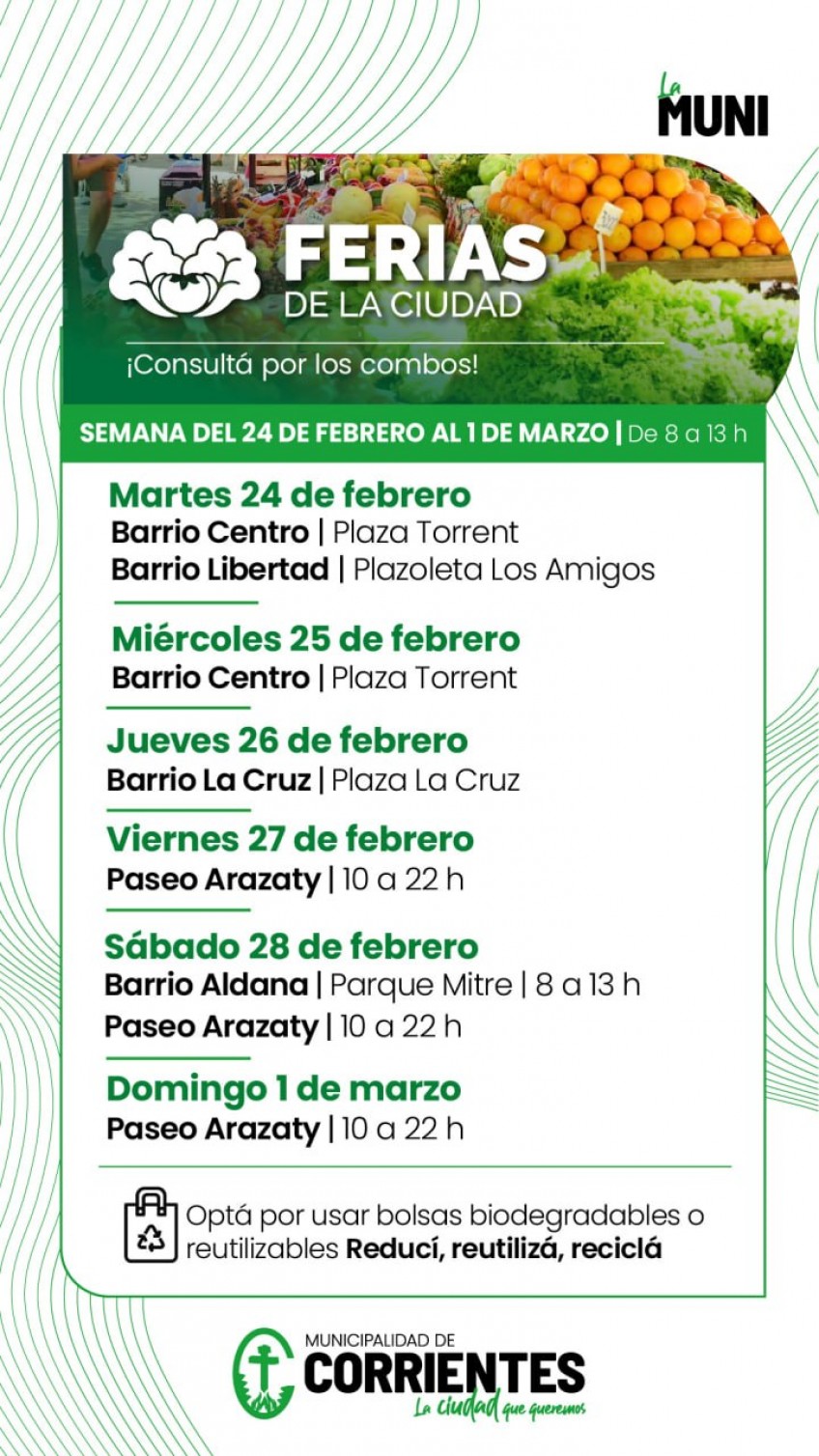 Entre el martes 24 y el domingo 29 de febrero, las ferias itinerantes organizadas por la Municipalidad volverán a realizar su habitual recorrido por espacios públicos de la ciudad, con su oferta de productos de calidad y mejores precios. Los vecinos podrán adquirir frutas y verduras, productos manufacturados, artesanías, plantas ornamentales, entre otras propuestas.