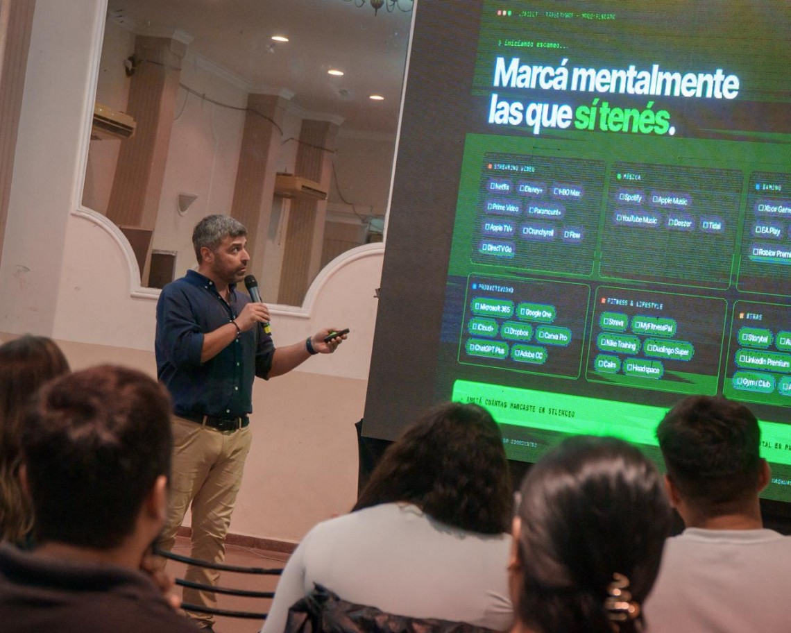 Durante la charla se trabajaron contenidos vinculados a la educación financiera en entornos digitales, con foco en el uso cotidiano de herramientas como billeteras virtuales, tarjetas y suscripciones digitales.