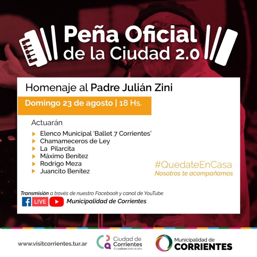 La Municipalidad de Corrientes este domingo vuelve a compartir a través de sus redes un nuevo encuentro de la Peña de la Ciudad 2.0. En esta oportunidad, se desarrollará un sentido y merecido homenaje al padre Julián Zini, que hace pocos días partió, pero dejó un legado cultural inconmensurable.