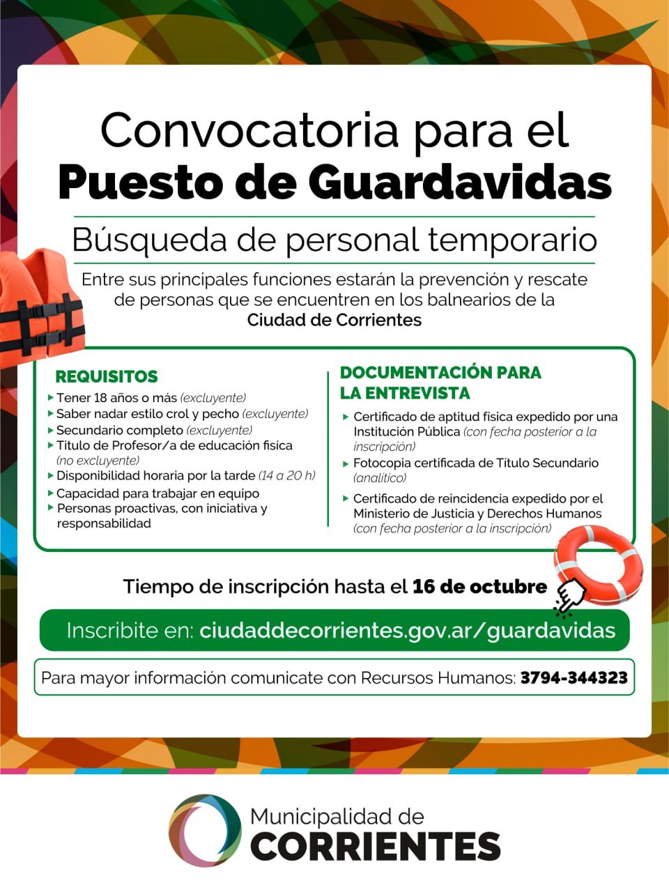 La convocatoria iniciada por la Municipalidad de Corrientes está dirigida a mayores de edad que sepan nadar, posean título secundario y tengan disponibilidad horaria por la tarde. Se valorará tener el título de profesor de educación física. Las inscripciones se reciben hasta el 16 de octubre. Se busca reforzar el actual plantel fijo de 25 guardavidas para la temporada de afluencia masiva.