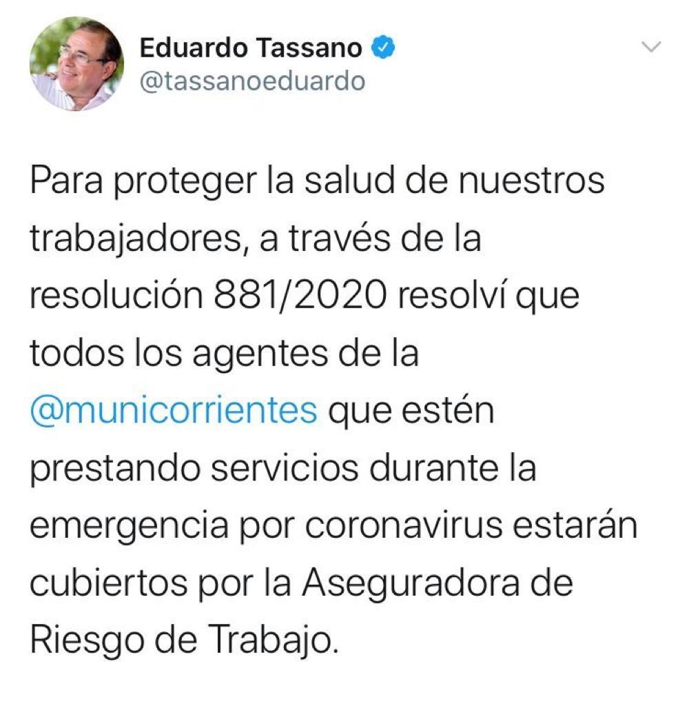 El intendente Eduardo Tassano rubricó este viernes la resolución 881/2020, a partir de la cual todos los trabajadores municipales que se encuentren prestando servicios durante la emergencia por la pandemia del coronavirus, estarán cubiertos por la Aseguradora de Riesgo de Trabajo (ART), con todas las prestaciones médicas incluidas, en el hipotético caso de que contraigan la enfermedad.