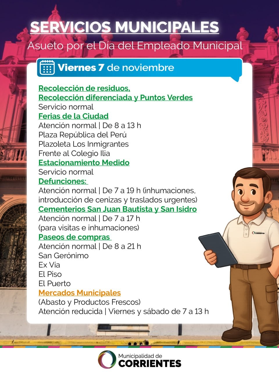 En virtud a la conmemoración por el Día del Empleado Municipal, el próximo 8 de noviembre, la Municipalidad de Corrientes informa que este viernes 7 algunas dependencias comunales estarán cerradas, aunque se garantiza el normal funcionamiento del servicio de recolección de residuos y habrá guardias en áreas operativas.