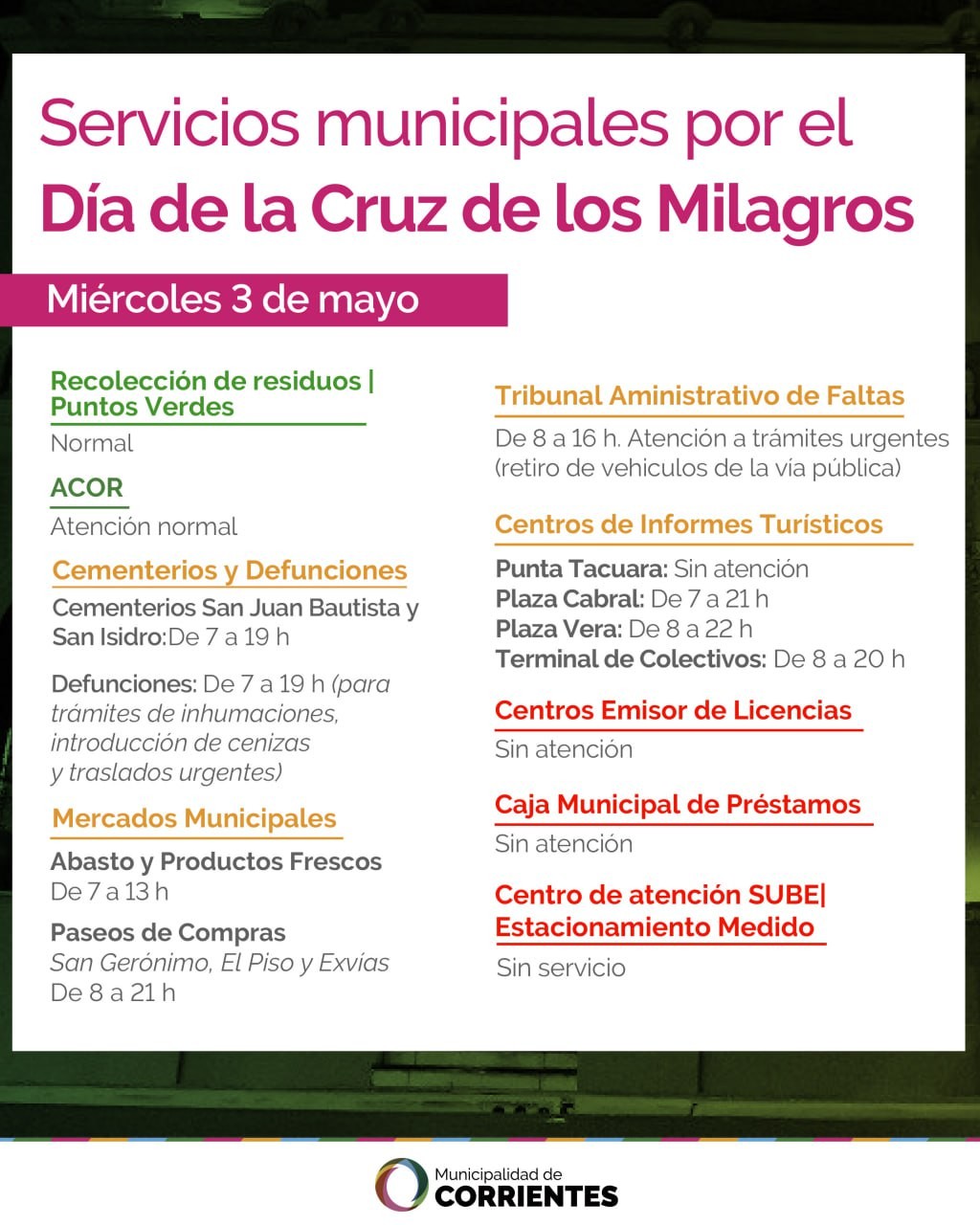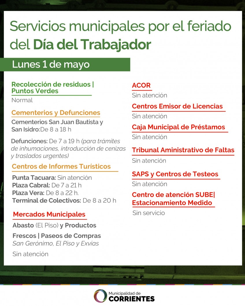 La Municipalidad de la Ciudad de Corrientes informa acerca del funcionamiento de los servicios que prestan sus diferentes áreas en virtud del feriado nacional del 1º de mayo por el Día del Trabajador y el asueto administrativo del miércoles por el Milagro de la Cruz.