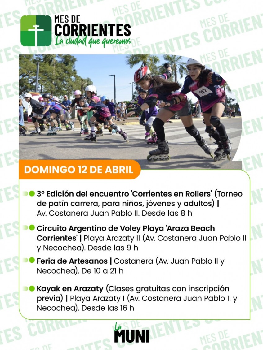 El domingo 12, la agenda continuará con una destacada variedad de actividades. Desde las 8, la Costanera Juan Pablo II será escenario de la tercera edición de “Corrientes en Rollers”, torneo de patín carrera para niños, jóvenes y adultos.