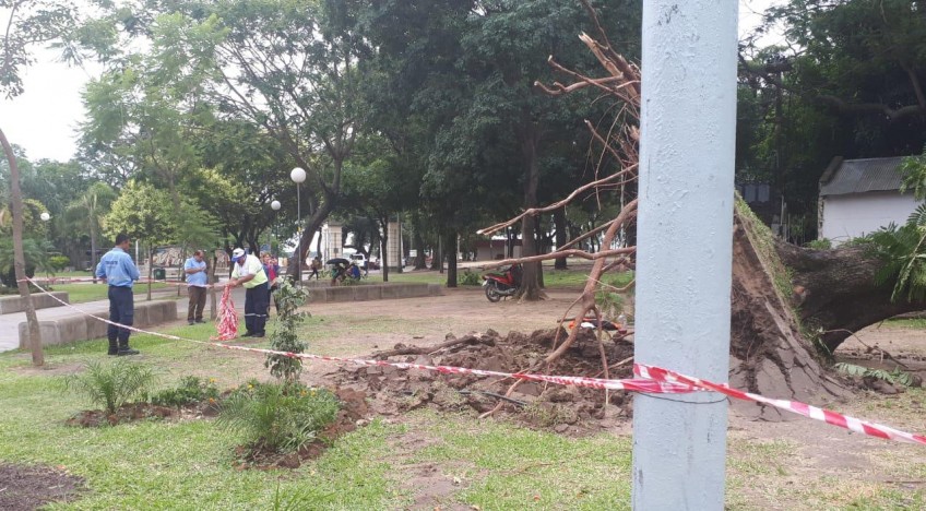 Agentes de la Secretaria de Ambiente trabajan en el Parque Mitre, Costanera, en calle San Juan, San Luis, Gutemberg, General Paz y Plaza La Cruz a raíz de árboles caídos. Operarios con máquinas trabajan para despejar las calles y veredas.