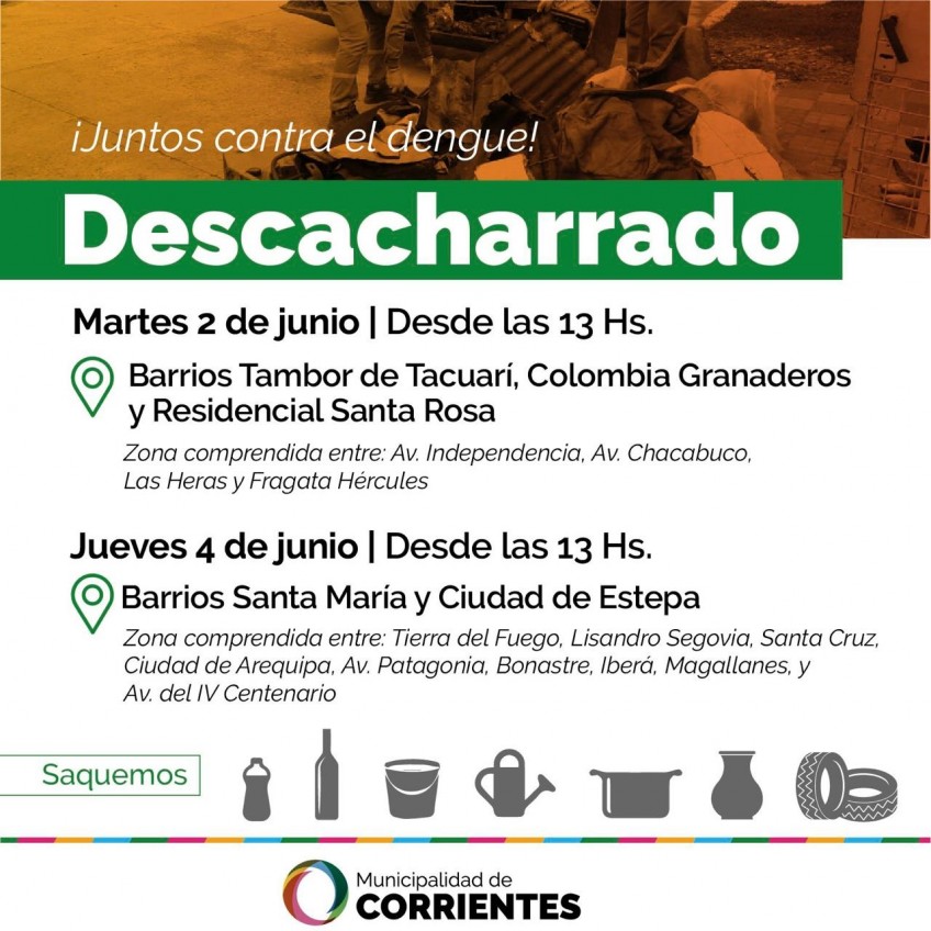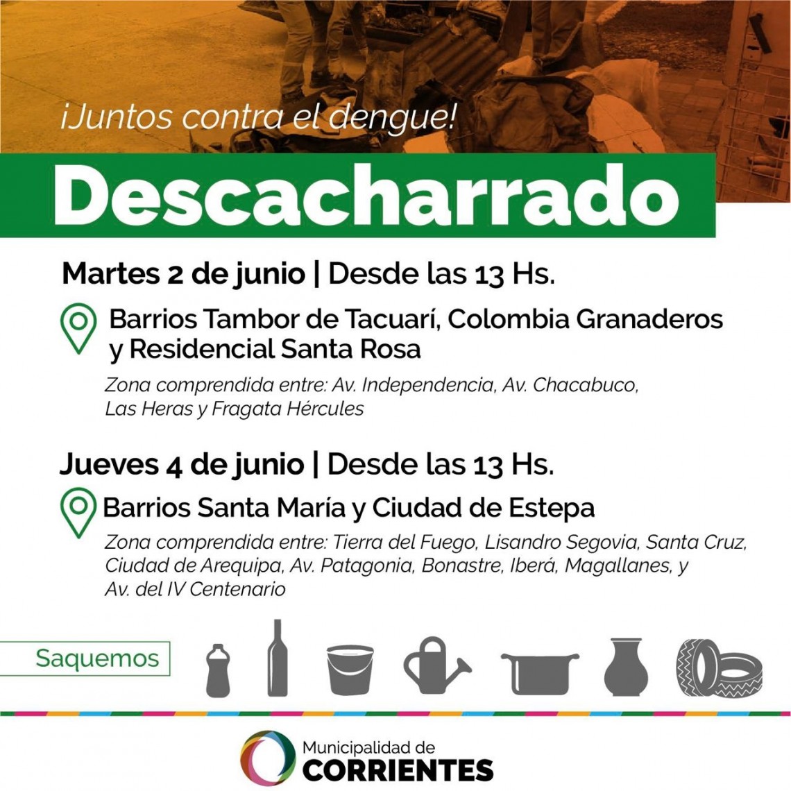 En el marco del plan de lucha contra el dengue que lleva adelante la Municipalidad de Corrientes en conjunto con el Gobierno de la Provincia, este martes 2 de junio inician los operativos de descacharrado en los barrios Santa Rosa, Tambor de Tacuari, Colombia Granaderos. En tanto que el jueves 4, será el turno del Santa María y Ciudad de Estepa.