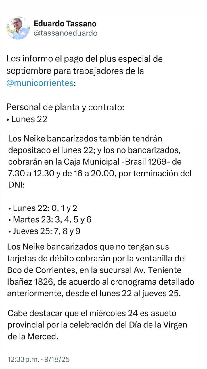 En tanto, los Neike bancarizados pero que no poseen tarjeta de débito, deberán cobrar por ventanilla del Banco de Corrientes (sucursal av. Teniente Ibáñez 1826) de acuerdo al cronograma detallado anteriormente, que va del lunes 22 al jueves 25 de septiembre.