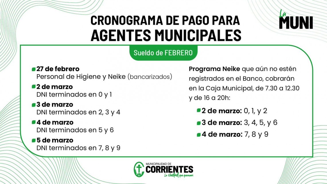 Este viernes 27 de febrero se pagará a los trabajadores de Higiene Urbana; en tanto que, tras el fin de semana, el lunes 2 de marzo será el turno de los agentes cuyos DNI finalicen en 0 y 1; el martes 3 de marzo continuará con el pago a quienes tengan DNI que terminen en 2, 3 y 4. Luego, el miércoles 4, se abonará a DNI terminados en 5 y 6; y concluirá el jueves 5 con documentos finalizados en 7, 8 y 9.