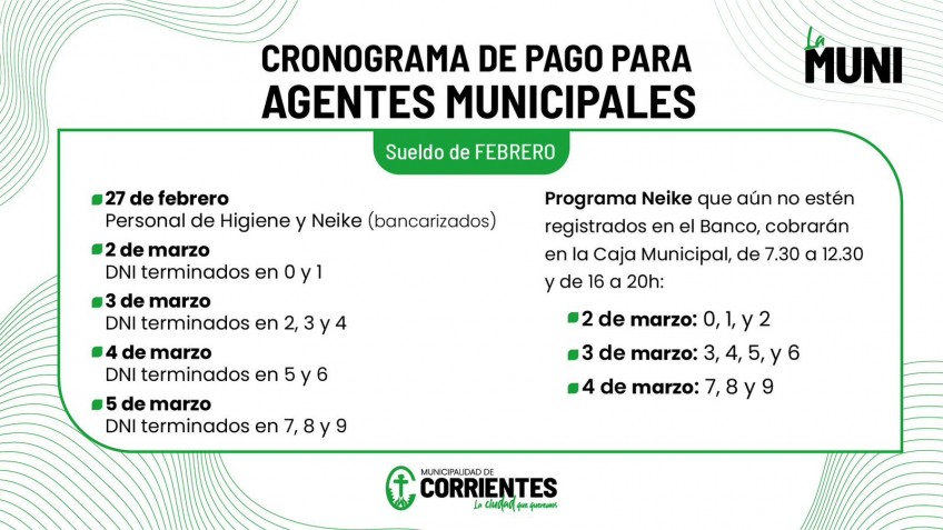 El cronograma salarial de la Municipalidad, correspondiente al mes de febrero, se extenderá hasta el jueves 5 de marzo.