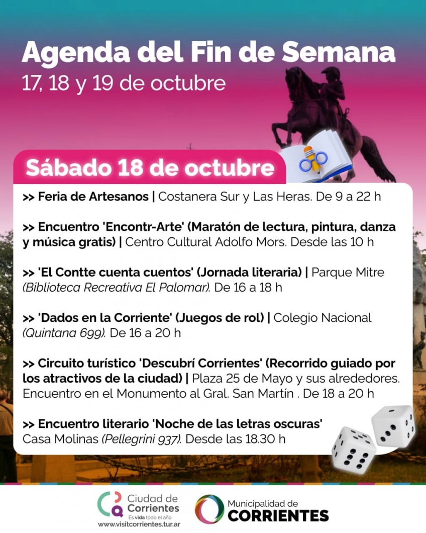 De viernes a domingo, la Municipalidad preparó distintas actividades para las familias correntinas. Entre ellas, habrá música, danza, encuentros literarios, recorridos pedestres y para los más jóvenes, la final de una importante competencia de freestyle. Quienes aún no encontraron un obsequio especial, lo pueden adquirir en las ferias de artesanos con propuestas únicas y novedosas.