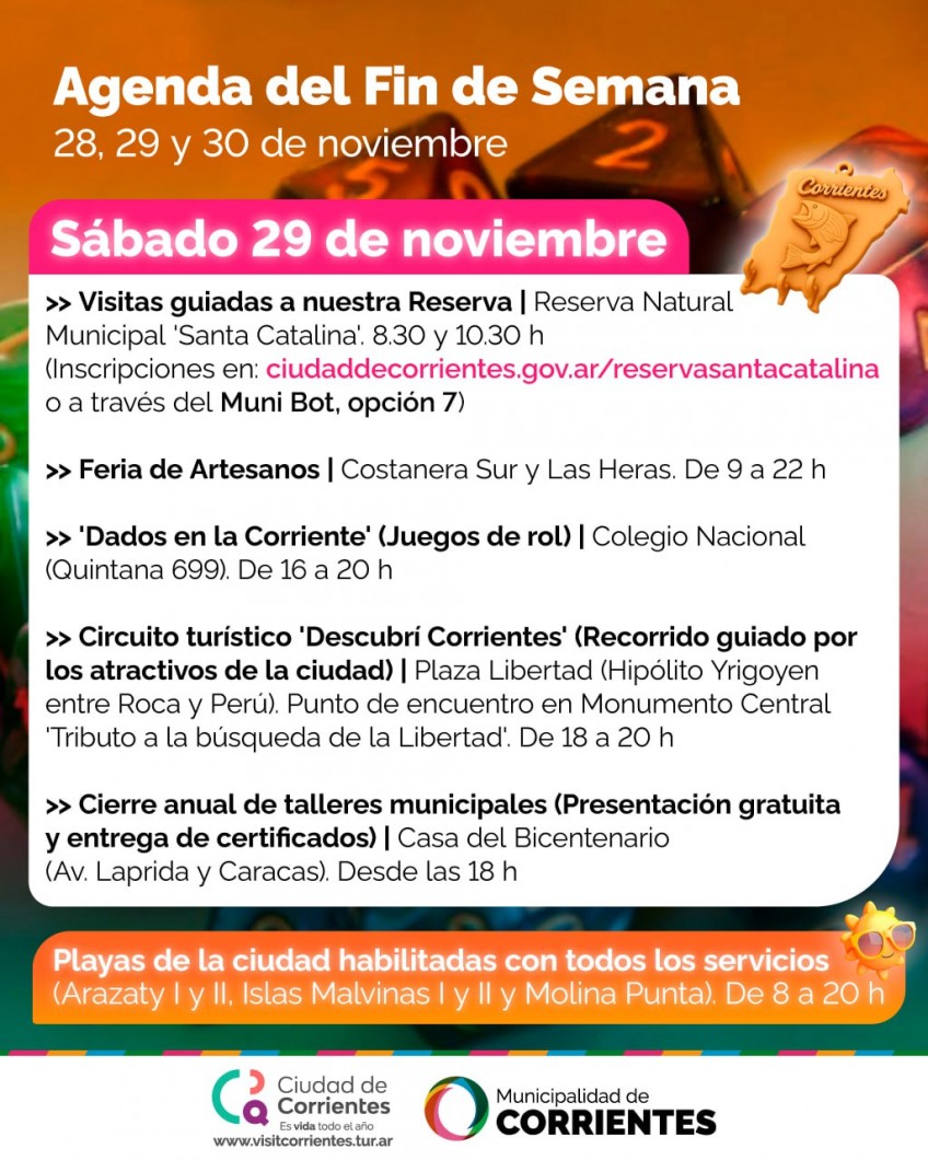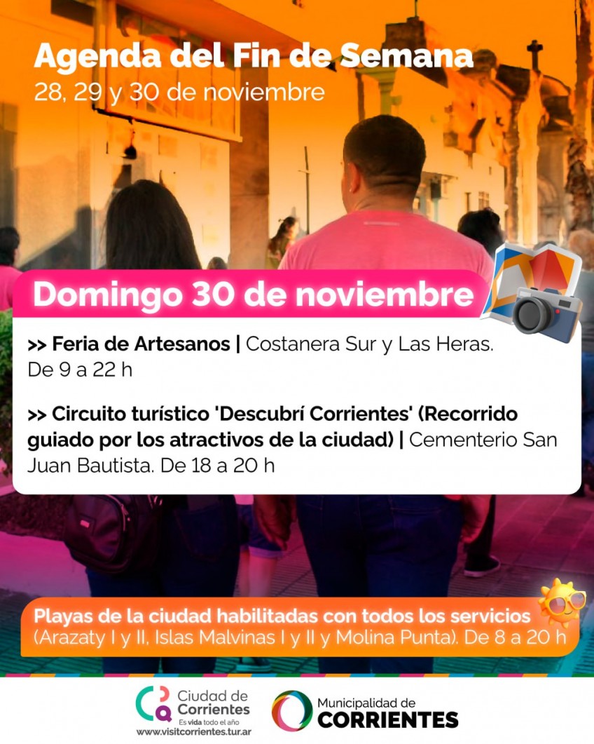Una vez más, desde el viernes al domingo, vecinos y visitantes podrán disfrutar de actividades organizadas por la Municipalidad de Corrientes totalmente gratuitas y al aire libre. Entre ellas, la Feria de Artesanos, recorridos pedestres por los principales atractivos de la ciudad y a la reserva Santa Catalina, al igual que los servicios y atractivos de la propuesta: sol y playa. Todas las actividades están sujetas a las inclemencias climáticas.