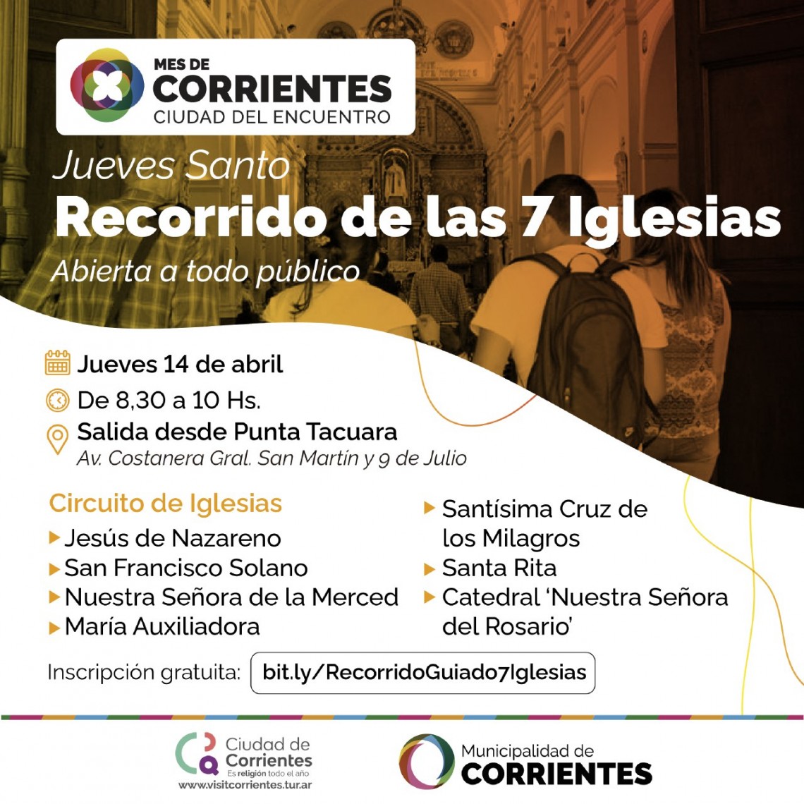 El secretario de Turismo y Deportes de la Muncipalidad de Corrientes, Juan Enrique Braillard Poccard recordó que “el recorrido por las siete Iglesias, es una de las tradiciones de la sociedad católica para conmemorar la Semana Santa y por ello, el próximo Jueves Santo -14 de abril- a partir de las 8.30, la Municipalidad de la ciudad de Corrientes dispondrá de micros que saldrán desde la Punta Tacuara, para realizar el recorrido guiado”.