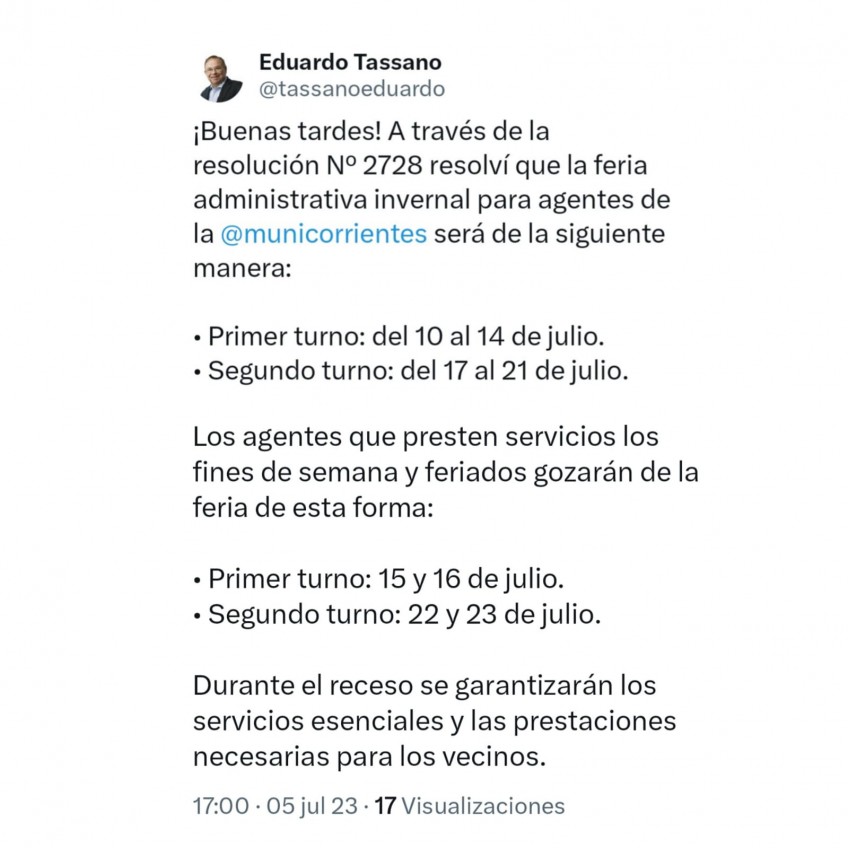 El intendente Eduardo Tassano resolvió que el receso para trabajadores de la Municipalidad de la ciudad de Corrientes se dividirá en dos turnos: del 10 al 14 de julio, el primero, y del 17 al 21, el segundo.