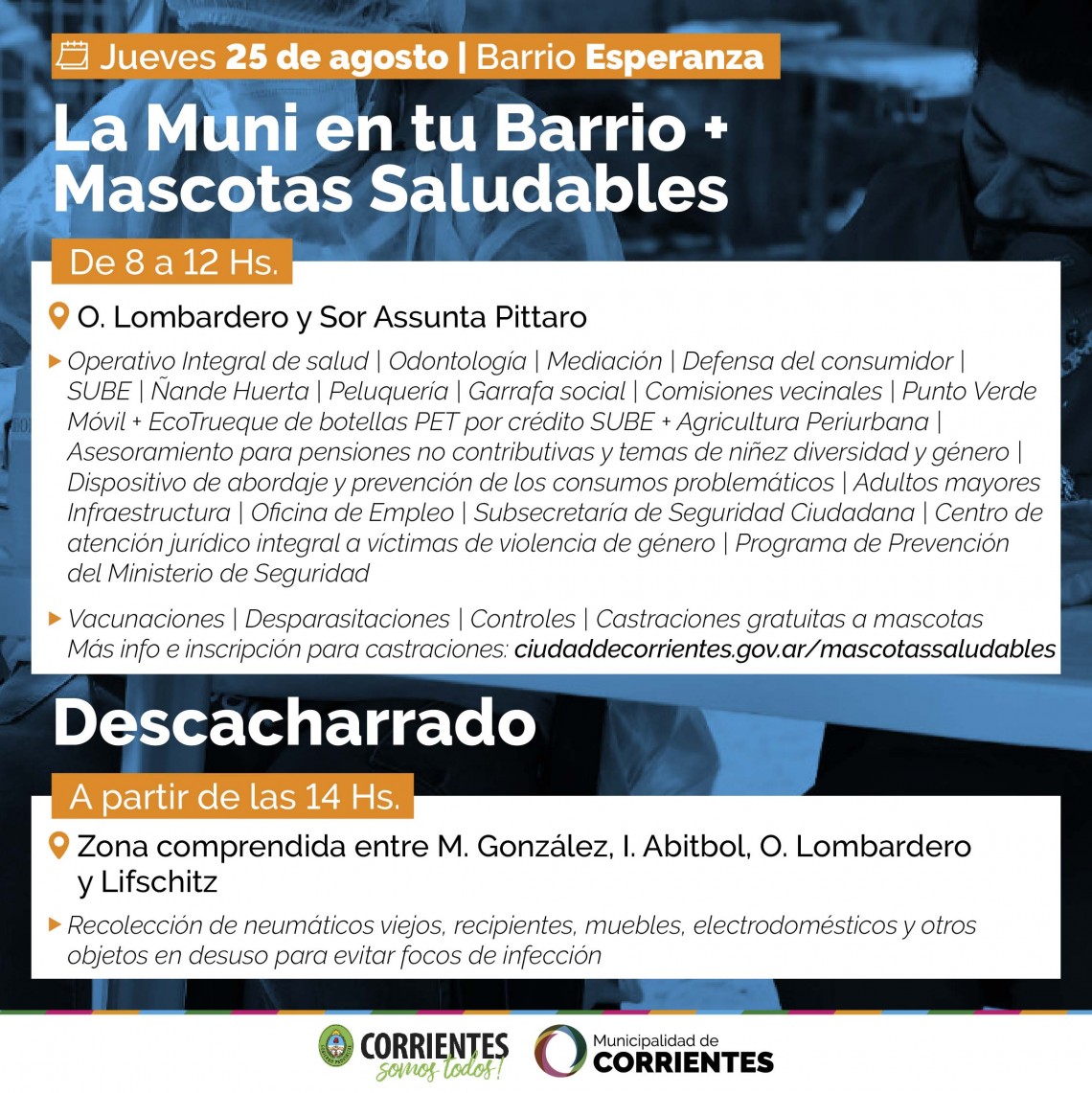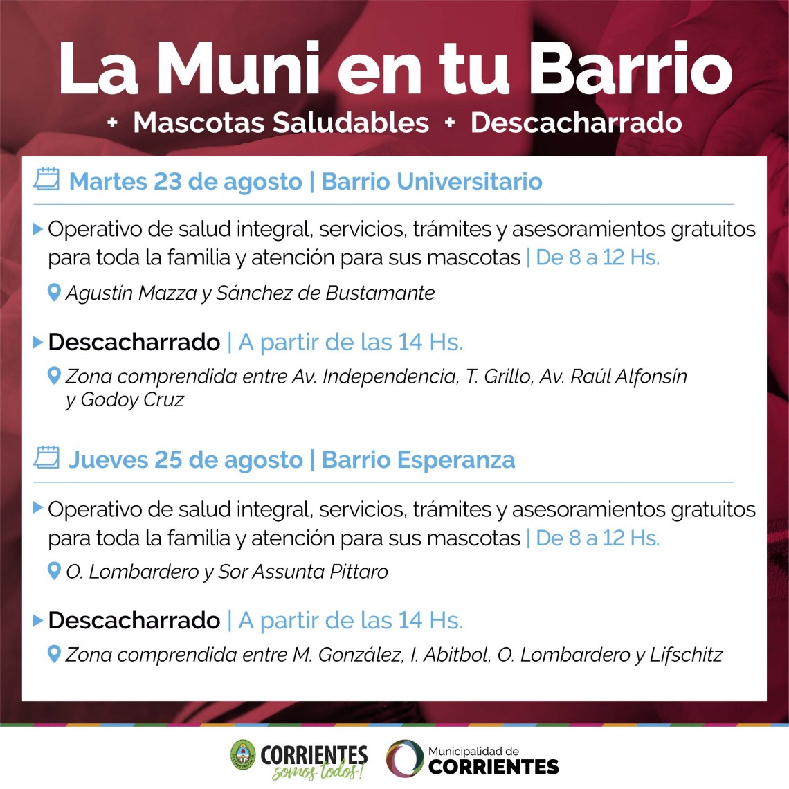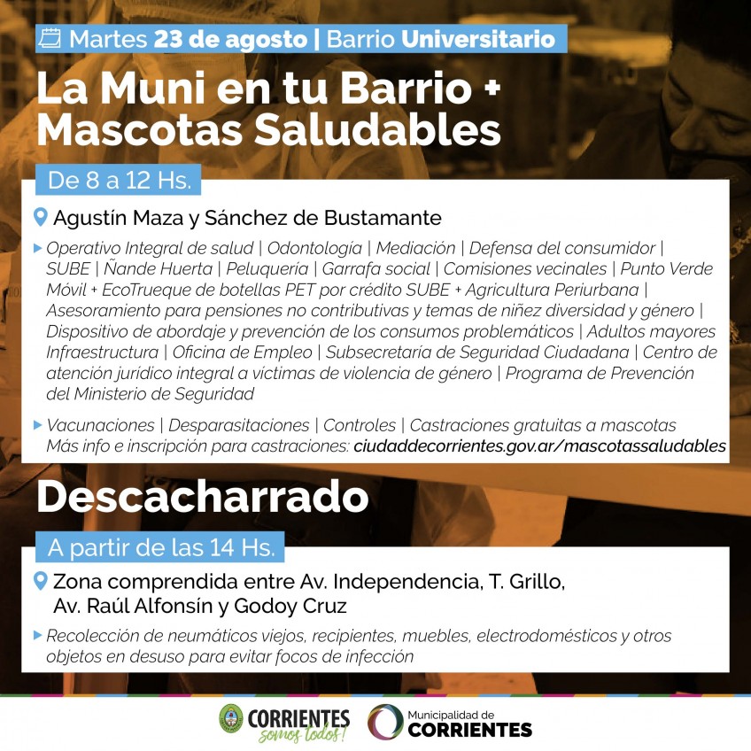Una vez más, la Municipalidad de Corrientes acercará diferentes prestaciones gratuitas para los vecinos de los barrios Universitario, el martes 23 y Esperanza, el jueves 25. Como es habitual habrá también atención veterinaria a través de la propuesta Mascotas Saludables y, por la tarde, el operativo de descacharrado para desechar todos los elementos que podrían actuar como focos para la reproducción del mosquito del Dengue, el Aedes aegypti.