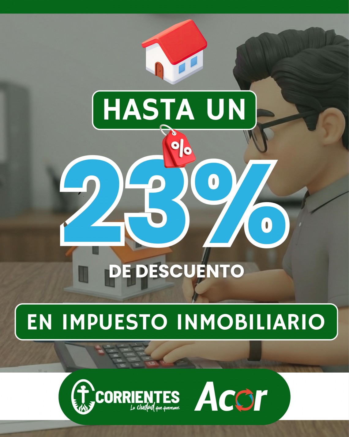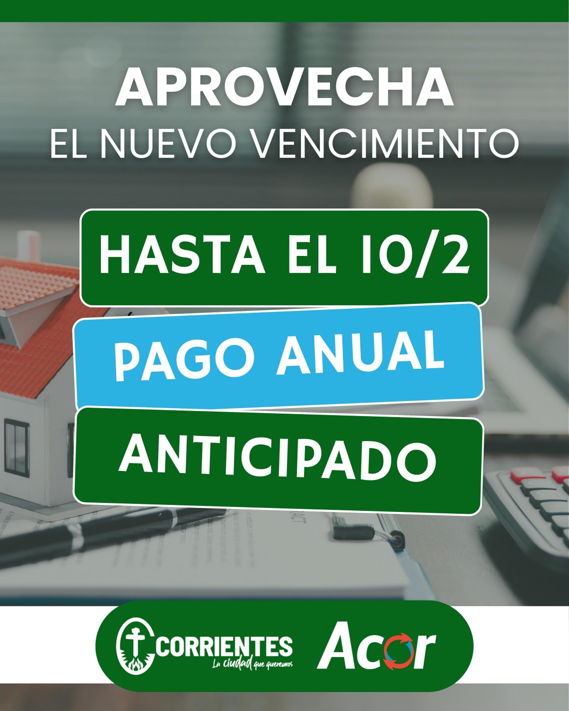 La Agencia Correntina de Recaudación (ACOR) señaló que los que se sumen al Pago Anual Anticipado hasta el 10 de febrero del 2026 tendrán un descuento de hasta el 38% en el impuesto automotor y del 23% en el impuesto inmobiliario. En el caso de los cementerios, aquel vecino que es destacado y buen contribuyente podrá acceder a un descuento de hasta el 50%.