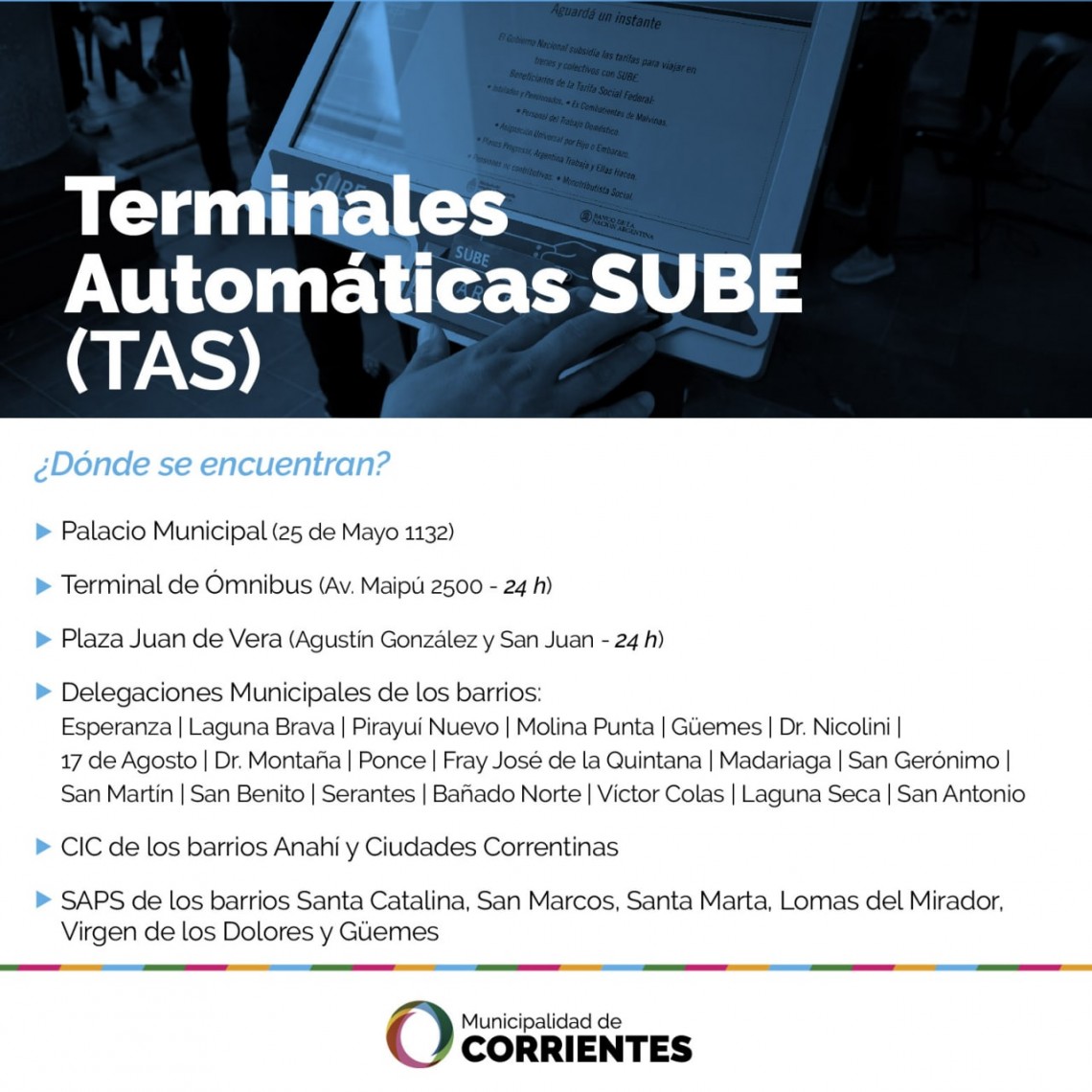 Además de las Terminales Automáticas SUBE (TAS) ubicadas en la Municipalidad, los usuarios cuentan con otros puntos de carga de tarjetas en la Terminal de Ómnibus (avenida Maipú 2500); en la plaza Juan de Vera (pasaje Agustín González y San Juan); en el Salón de Usos Múltiples del barrio San Gerónimo; en el Centro Integrador Comunitario del barrio Anahí (Cristo Obrero 345) y del Ciudades Correntinas (Turín y Tupac Amarú).