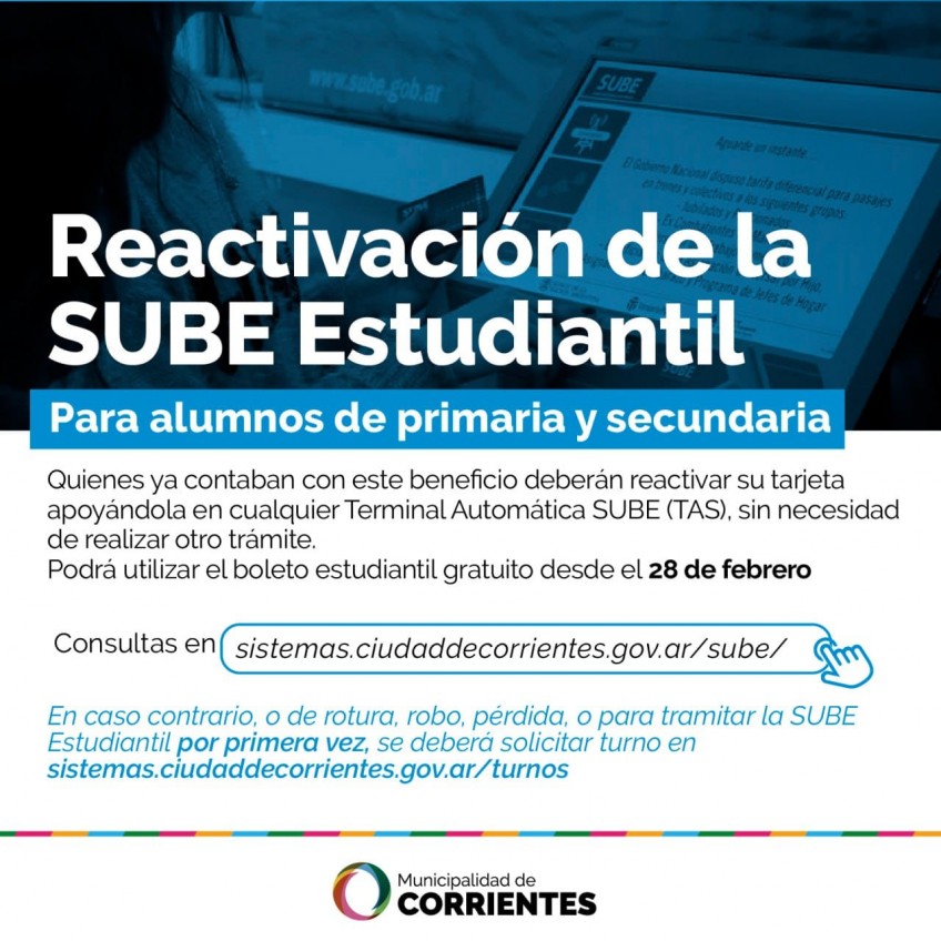 La Municipalidad de Corrientes instrumentó la reactivación automática del boleto estudiantil gratuito en el transporte urbano de pasajeros para todos aquellos alumnos de los niveles primarios y secundarios que ya contaban con dicho beneficio, y que a partir del martes 28 de febrero inicien las clases en los diferentes establecimientos educativos de la ciudad.
