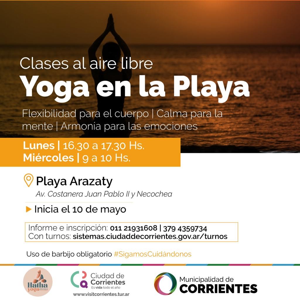 Con todas las medidas sanitarias por la pandemia del coronavirus, la Municipalidad de Corrientes iniciará las actividades deportivas y recreativas en la playa Arazaty. El lunes 10 de mayo comenzarán las clases de yoga, mientras que el miércoles 19 harán lo propio las de ritmos latinos.