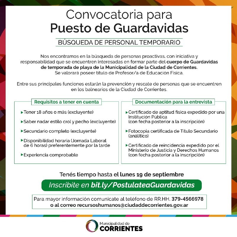 La Municipalidad de Corrientes realizó una convocatoria para cubrir puestos de guardavidas con vista a la temporada de playa 2022/23. Los interesados deberán completar el formulario de inscripción en bit.ly/PostulateaGuardavidas, hasta el lunes 19 de septiembre.