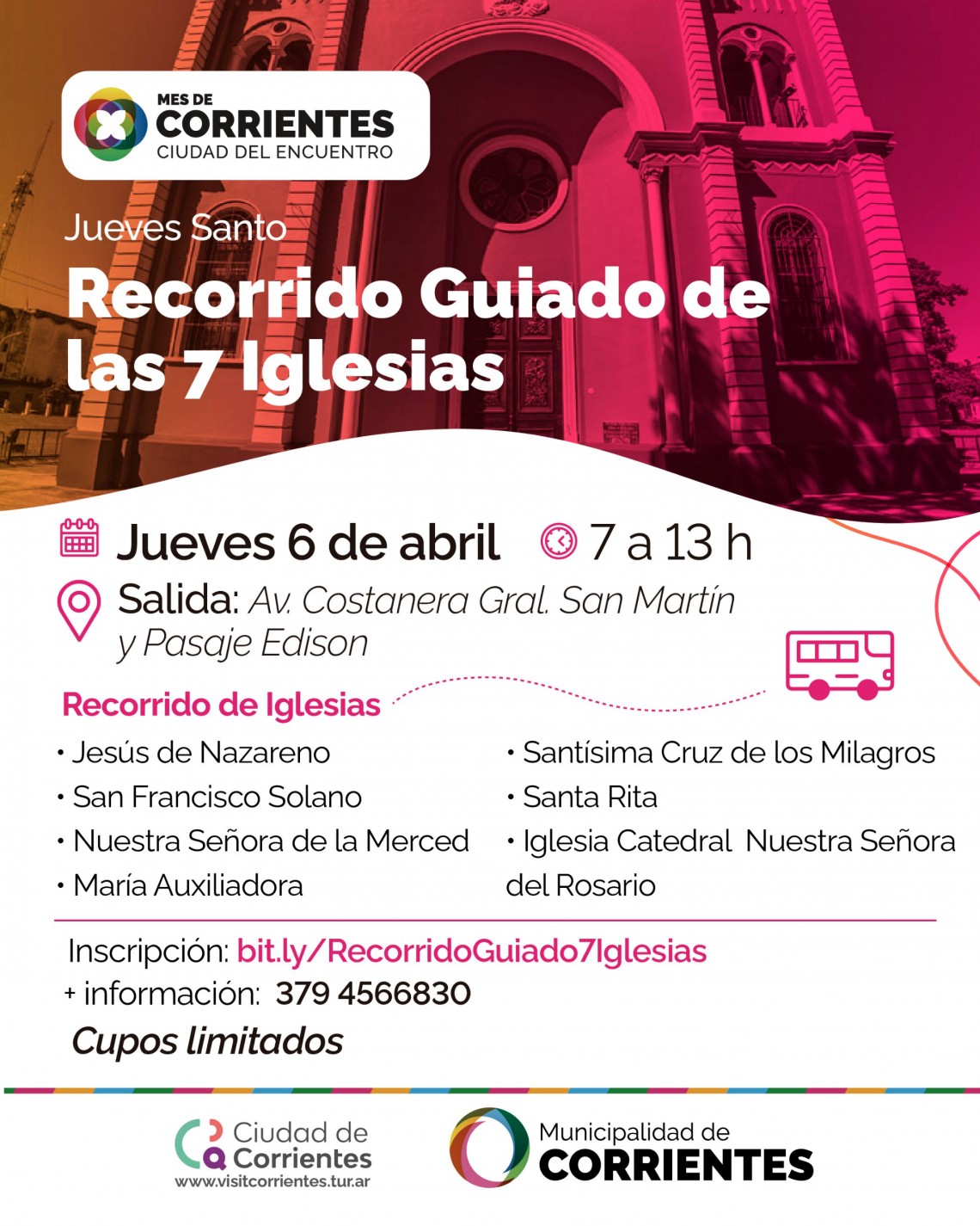 La actividad religiosa, turística y cultural se llevará adelante el 6 de abril. Los colectivos gratuitos saldrán por la mañana desde la avenida Costanera General San Martín y Edison. Los cupos son limitados y las inscripciones se pueden realizar al link: bit.ly/RecorridoGuiado7Iglesias.