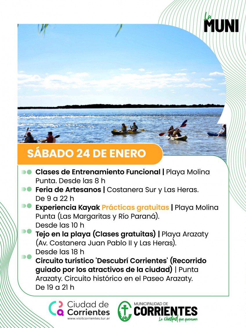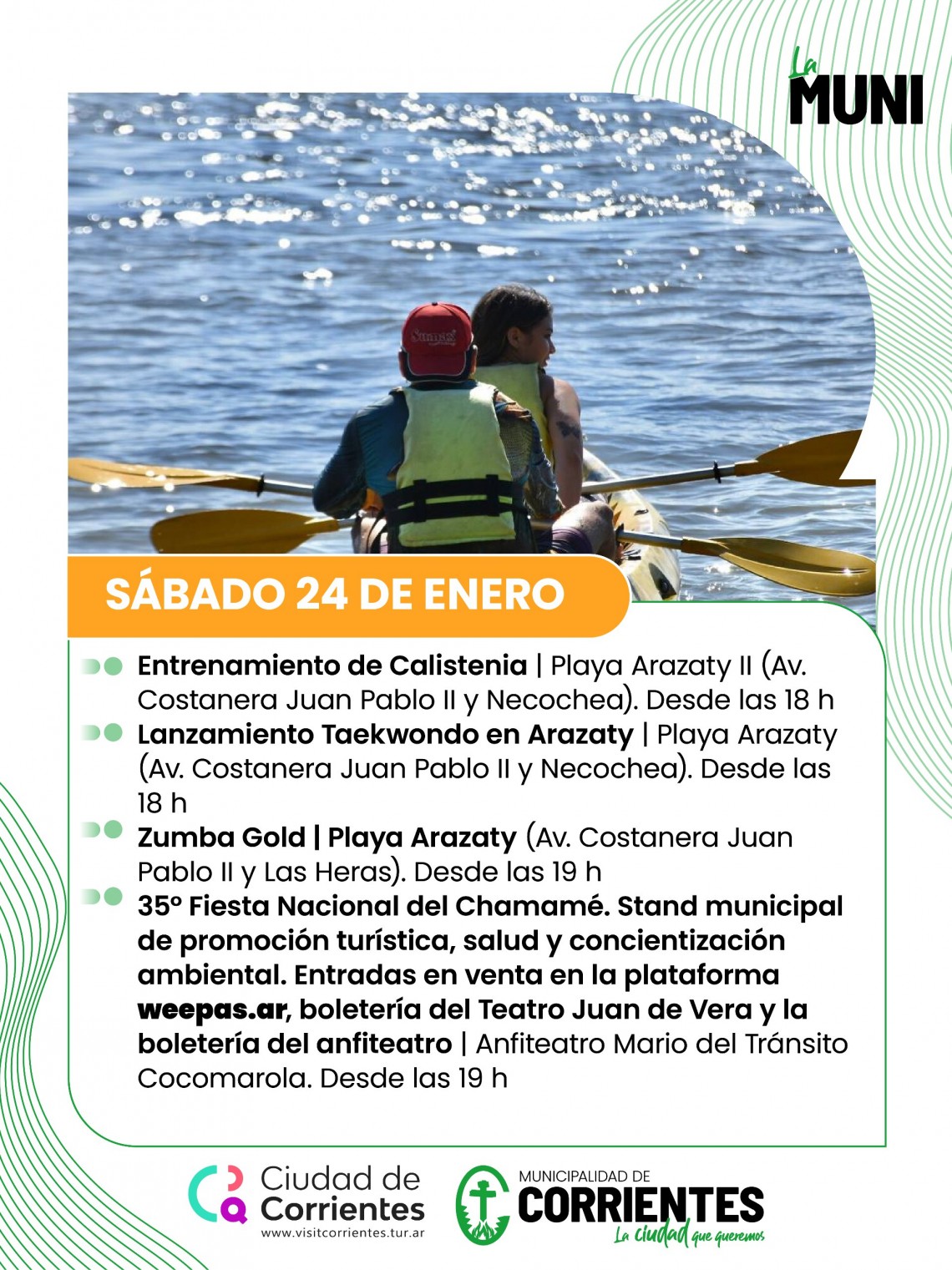 La Municipalidad de Corrientes propone para este fin de semana una amplia agenda de actividades gratuitas y abiertas a todo público, pensadas tanto para vecinos como para turistas. Del viernes 23 al domingo 25 de enero habrá ferias, circuitos turísticos, actividades deportivas en la playa y la continuidad de la 35° Fiesta Nacional del Chamamé, con presencia del stand municipal de promoción turística, salud y concientización ambiental.