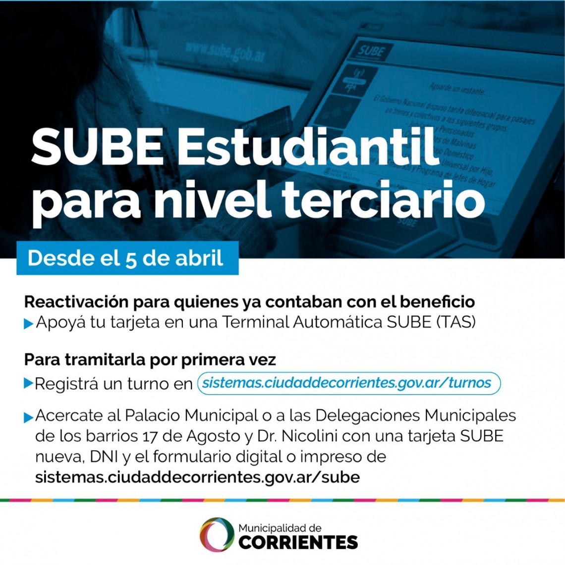 Por otra parte, el Subsecretario de Transporte precisó que aquellos estudiantes que hayan ingresado este año al terciario “simplemente tienen que entrar a la página de la Municipalidad (sistemas.ciudaddecorrientes.gov.ar/sube/), sacar un turno, bajar el formulario de empadronamiento y acercarse al punto donde saquen el turno, con una tarjeta, el DNI y el formulario”.