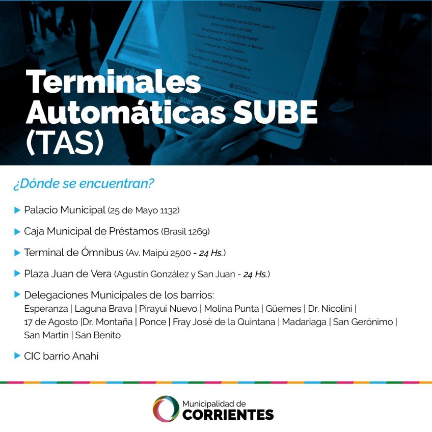 Los puntos SUBE que actualmente se encuentran operativos son el Palacio Municipal (25 de Mayo 1132), y las delegaciones de los barrios 17 de Agosto (avenida Cazadores Correntinos 5650) y Doctor Nicolini (Centro Comercial, local 8). Todas funcionan de lunes a viernes de 7 a 13.
