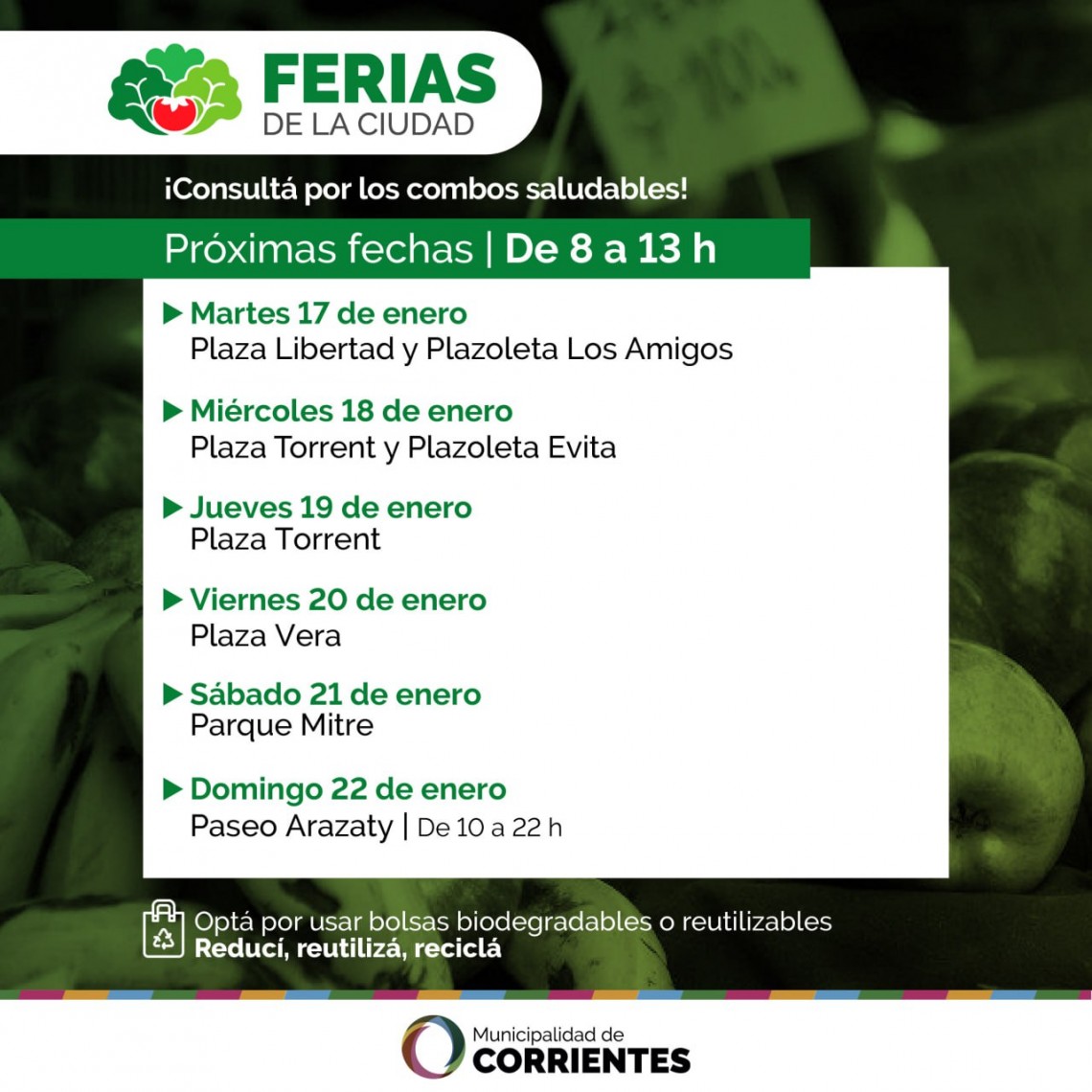 El año comenzó con nuevos recorridos de las Ferias de la Ciudad, propuesta municipal que ratifica el objetivo de promover la producción local colaborando con la economía familiar de los vecinos de Corrientes. Feriantes del programa impulsado y coordinado desde la Municipalidad de Corrientes comercializarán frutas y verduras, además de productos panificados caseros, dulces regionales, artesanías, y plantas ornamentales entre el martes 17 y el domingo 22 en distintos paseos y espacios públicos. El recorrido iniciará el martes 17 de diciembre en las plazas Libertad (San Martín y Perú) y Los Amigos (Juan Pujol –Poncho Verde- y Brasil) del barrio Libertad, para continuar el miércoles 18 en la plaza Torrent (San Lorenzo y Bolívar) y plaza Evita (Av. Sarmiento y Av. Maipú). El jueves 19 los puesteros se ubicarán nuevamente en plaza Torrent, mientras que el viernes 20 estarán en la plaza Vera (Agustín González y San Juan). El recorrido continuará el sábado 21 por la calle Pilú Gómez, en el parque Mitre. En tanto que el domingo 22 habrá puesteros en el paseo Arazaty que ofrecerán de 9 a 22, plantas ornamentales, ofertas gastronómicas, artesanías y manualidades. CRONOGRAMA Martes 17 de enero en el barrio Libertad (plazas Libertad y Los Amigos) Miércoles 18 de enero en el barrio Centro (plaza Torrent) y barrio Berón de Astrada (plazoleta Evita) Jueves 19 de enero en el barrio Centro (plaza Torrent). Viernes 20 de enero en el microcentro (plaza Vera) Sábado 21 de enero en el Parque Mitre Domingo 22 de enero en el Paseo Arazaty