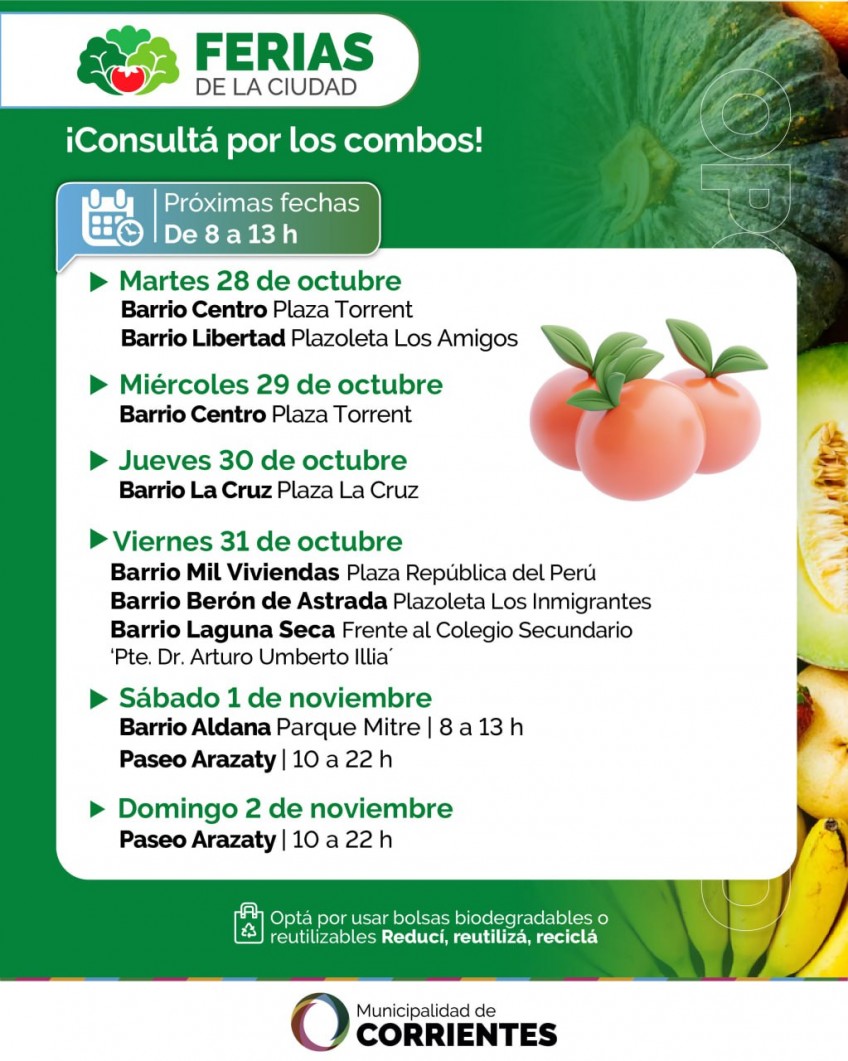 Los feriantes se presentarán entre el martes 28 de octubre y el domingo 2 de noviembre en diferentes espacios verdes y recreativos de la capital. Como lo vienen haciendo a lo largo del año, comercializarán productos de calidad y a precios convenientes, en esta ocasión priorizando aquellos de la nueva temporada.