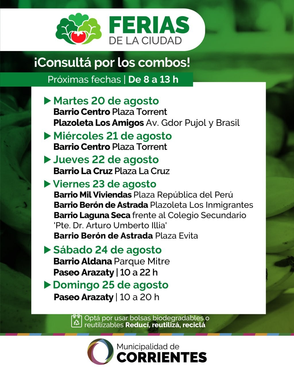 La Municipalidad de Corrientes continúa acercando productos de calidad, con interesantes ofertas y combos, en diferentes barrios de la ciudad, a través de las Ferias de la Ciudad. Este programa es coordinado por la Secretaría de Desarrollo Económico municipal, a través de la Subsecretaría de Economía Social.
