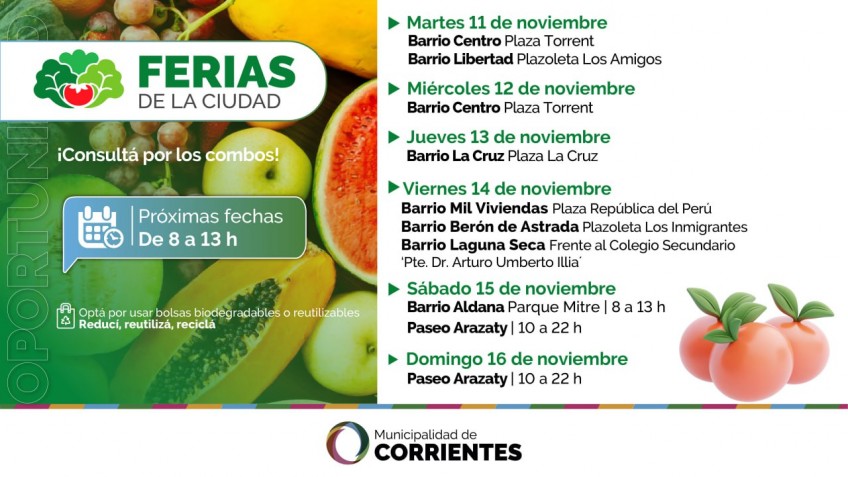 El jueves 13 de noviembre los feriantes se presentarán en la plaza La Cruz, mientras que el viernes 14 se repetirá la propuesta en el predio de Larrea al 3400 (frente al Colegio Illia) del barrio Laguna Seca; en la plaza República del Perú de las Mil Viviendas; y en la plazoleta Los Inmigrantes del barrio Berón de Astrada.