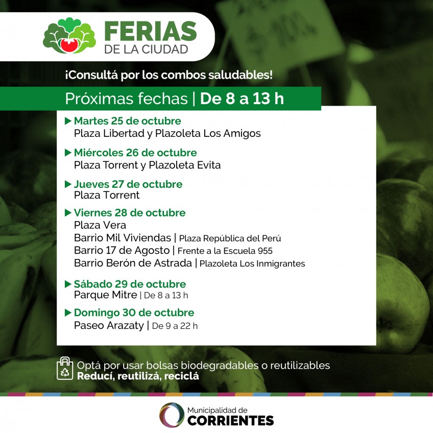 Desde el martes 25 al domingo 30 de octubre los productores estarán en diferentes espacios verdes de la ciudad como las plazas Libertad, Torrent, Vera y las plazoletas Los Amigos, Evita, Los Inmigrantes y República del Perú. También el fin de semana en el parque Mitre y en el Paseo Arazaty.