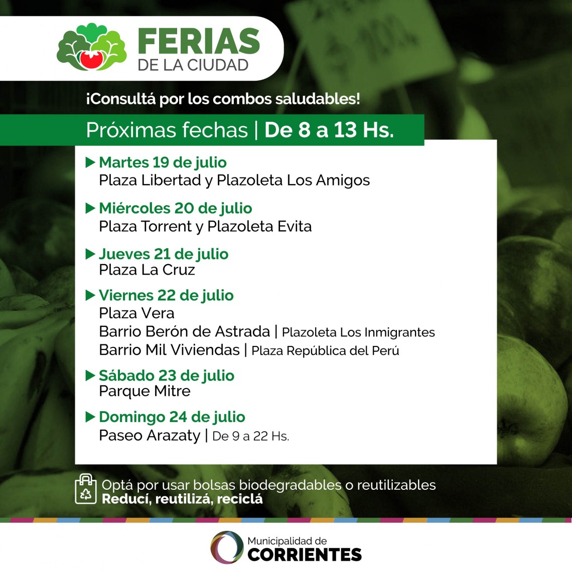 Las Ferias de la Ciudad repetirán, entre el martes 19 y el domingo 24 de julio, su recorrida por los barrios de Corrientes repitiendo el éxito constante de calidad y mejores precios. La iniciativa es coordinada y organizada desde la Municipalidad de Corrientes, a través de la subsecretaría de Economía Social, dependiente de la secretaría de Desarrollo Económico.