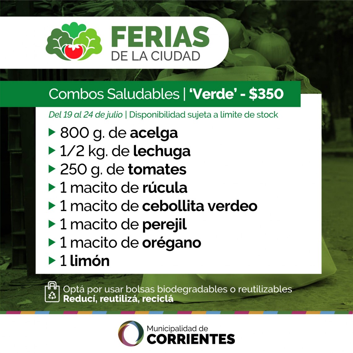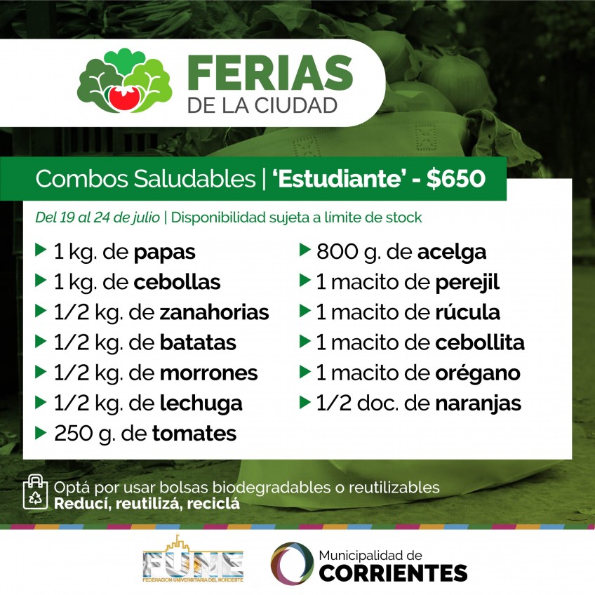 Como es habitual, en las ferias estarán en oferta los Combos Saludables Estudiante (a 650 pesos) y Verde (350 pesos). Los mismos se venderán hasta agotar stock.