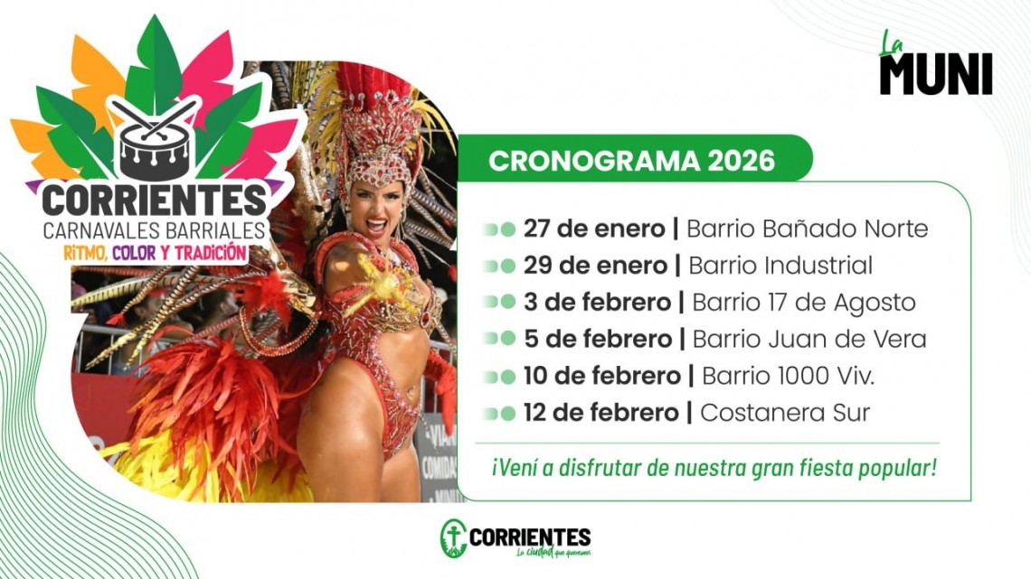 Con entrada libre y gratuita, los Carnavales Barriales de Corrientes se consolidan como una expresión cultural identitaria, que combina arte, inclusión social y participación comunitaria, llevando la fiesta del carnaval al corazón de cada barrio de la ciudad.