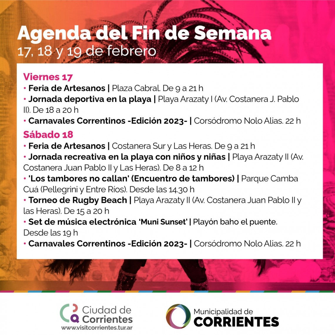 Se espera un intenso movimiento turístico en la ciudad de Corrientes por el fin de semana largo de carnaval. La Municipalidad preparó una gran variedad de actividades culturales y deportivas para el disfrute de los visitantes y de todos los vecinos. Entre las que se encuentran, eventos musicales, playeras y las clásicas ferias, que se suman a las últimas noches de desfile en el corsódromo Nolo Alías.
