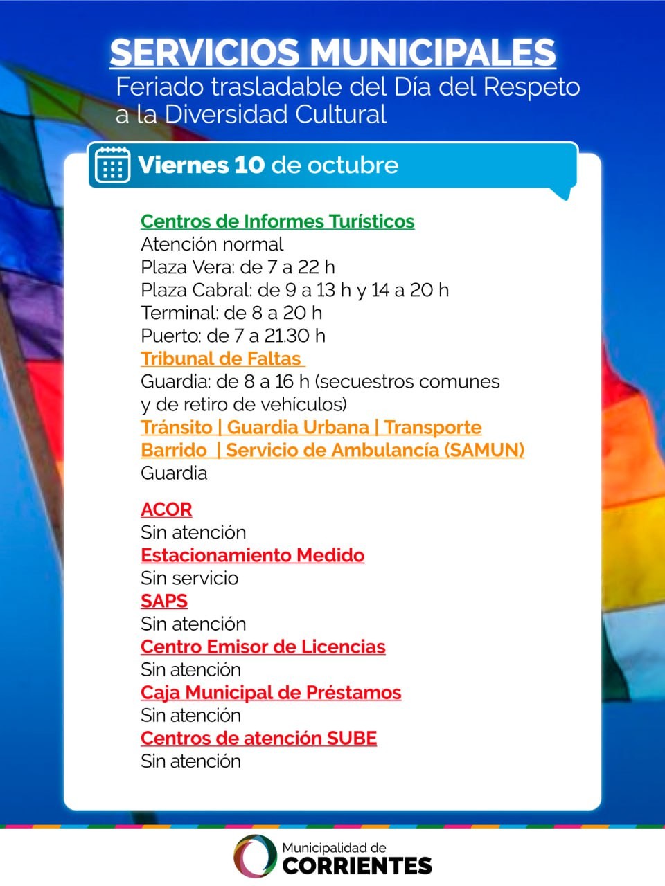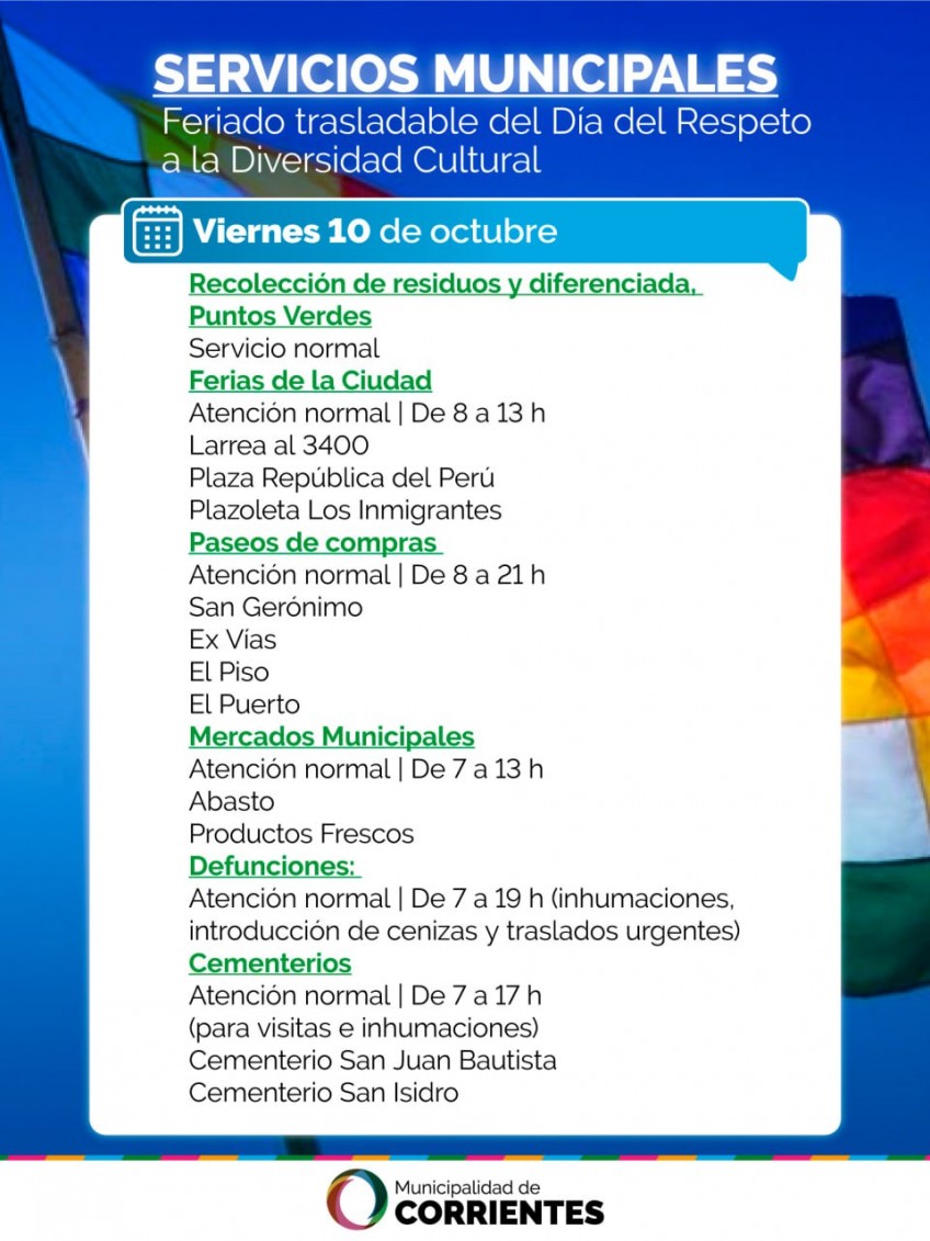 La Municipalidad de Corrientes informa acerca del funcionamiento de las dependencias y servicios que tiene a su cargo con motivo del feriado nacional de este viernes 10 de octubre, trasladado del 12 de octubre por el Día del Respeto a la Diversidad Cultural.