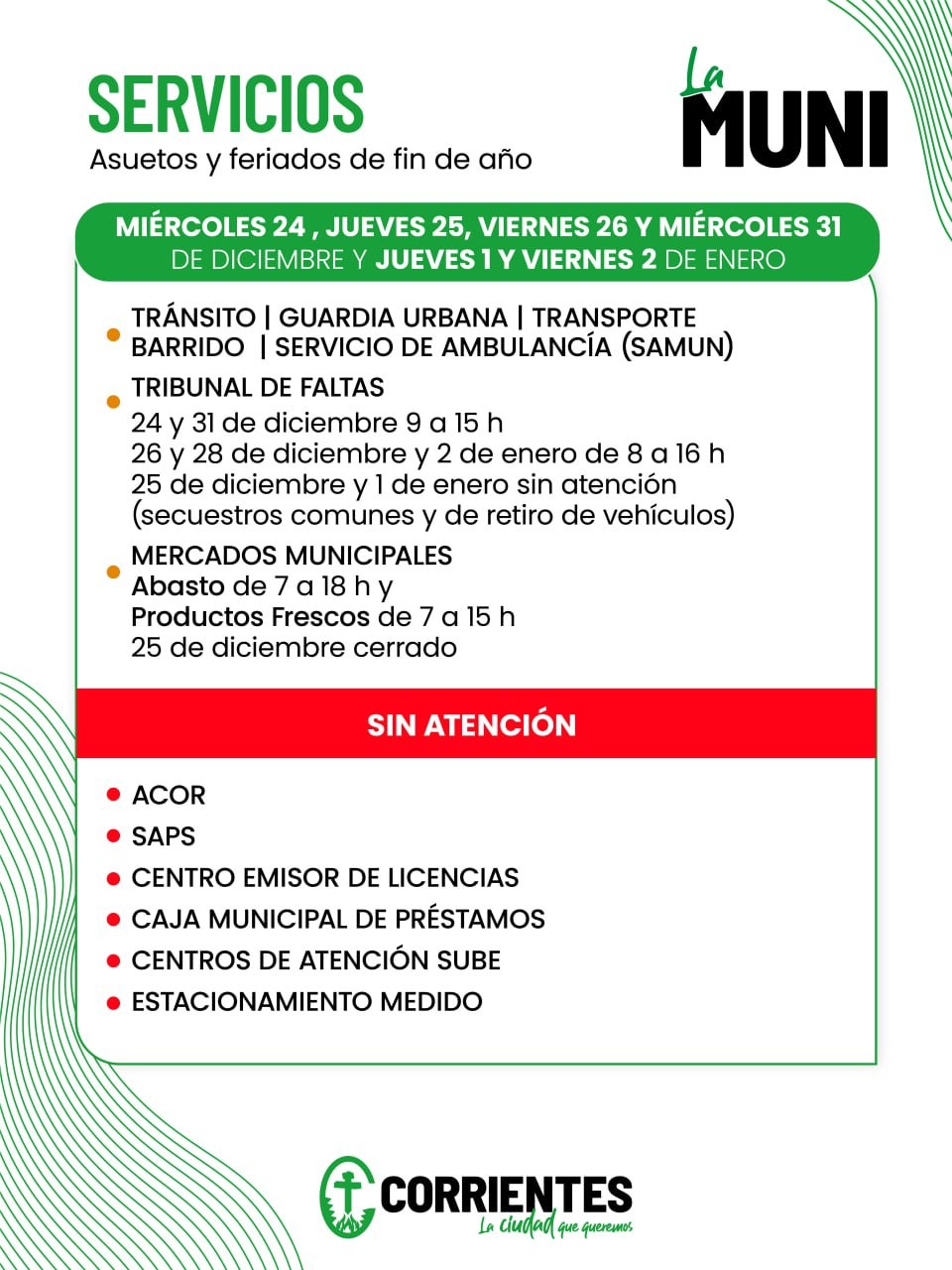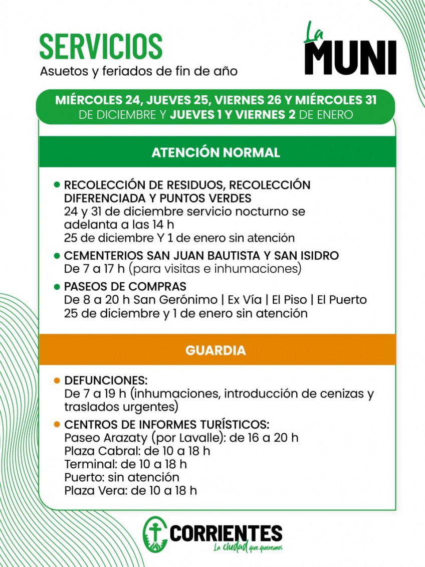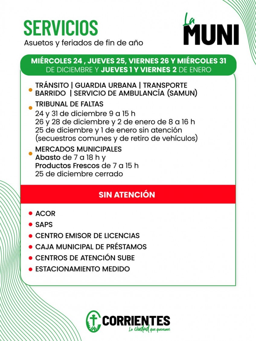 La Municipalidad de Corrientes informa acerca de los servicios municipales durante las fiestas de fin de año, considerando los asuetos administrativos dispuestos por el Departamento Ejecutivo para los días 24, 26 y 31 de diciembre, y 2 de enero próximos, así como los feriados nacionales del 25 de este mes y el 1 de enero de 2026.