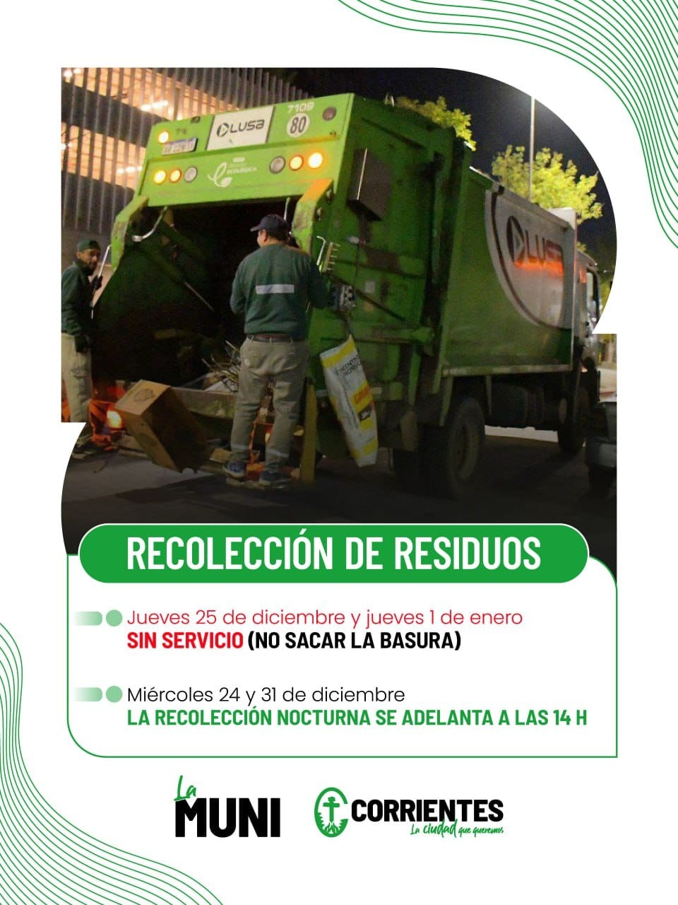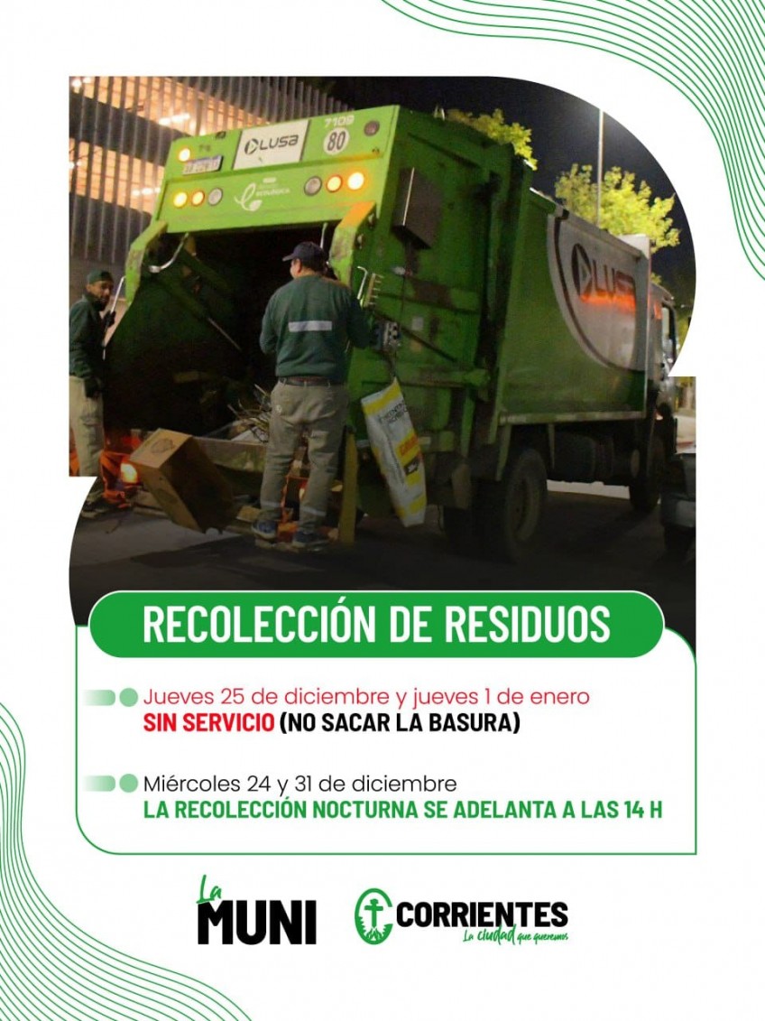 La Secretaría de Servicios Públicos comunicó que los días 25 de diciembre y 1 de enero no habrá recolección de residuos. Los días 24 y 31 del presente el servicio se prestará normalmente por la mañana, mientras que en las zonas donde se retiran los residuos en horario nocturno, se adelantará a partir de las 14:00 horas.