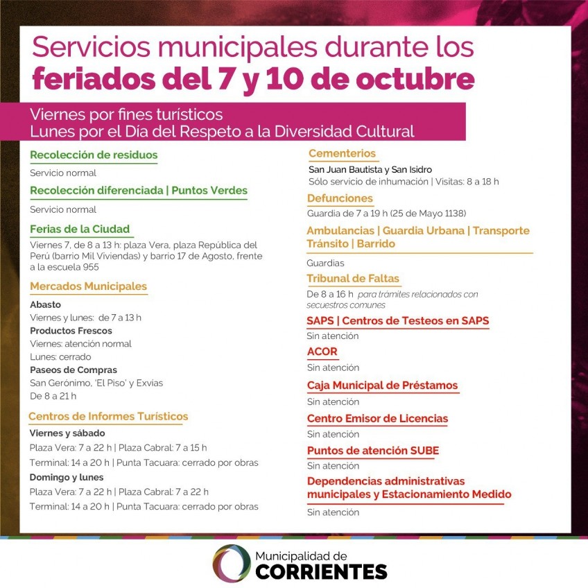 La Municipalidad de Corrientes informa acerca del funcionamiento de los servicios a su cargo durante el fin de semana largo, a raíz de los feriados nacionales del viernes 7, con fines turísticos, y del lunes 10 del corriente, adelantado en conmemoración por el Día del Respeto a la Diversidad Cultural.