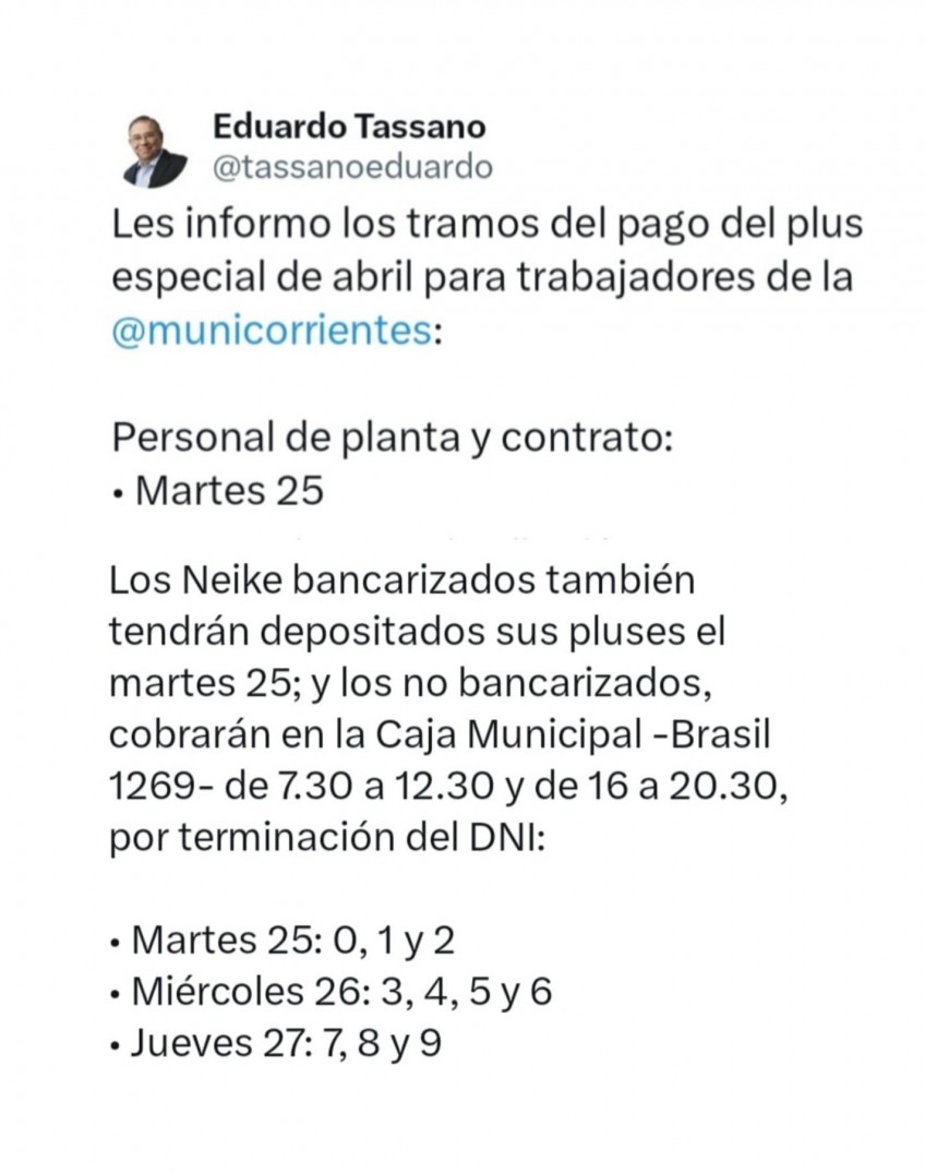 Este martes 25, la Municipalidad de Corrientes iniciará el pago del plus especial de abril para todo el personal, según informó el intendente Eduardo Tassano.